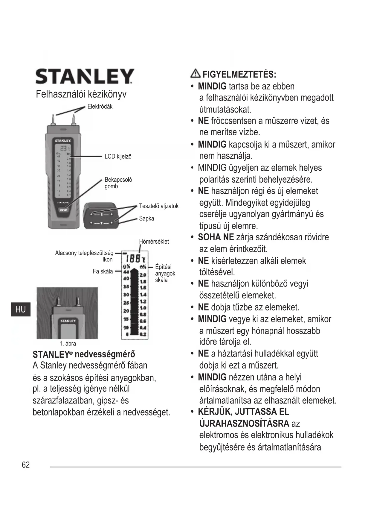 A Stanley ceg a vásárlás idöpontjától számított egy év garanciát vällal elektronikus méromuszereinek anyaghibáiert és/vagy gyartásirendellenességiert.