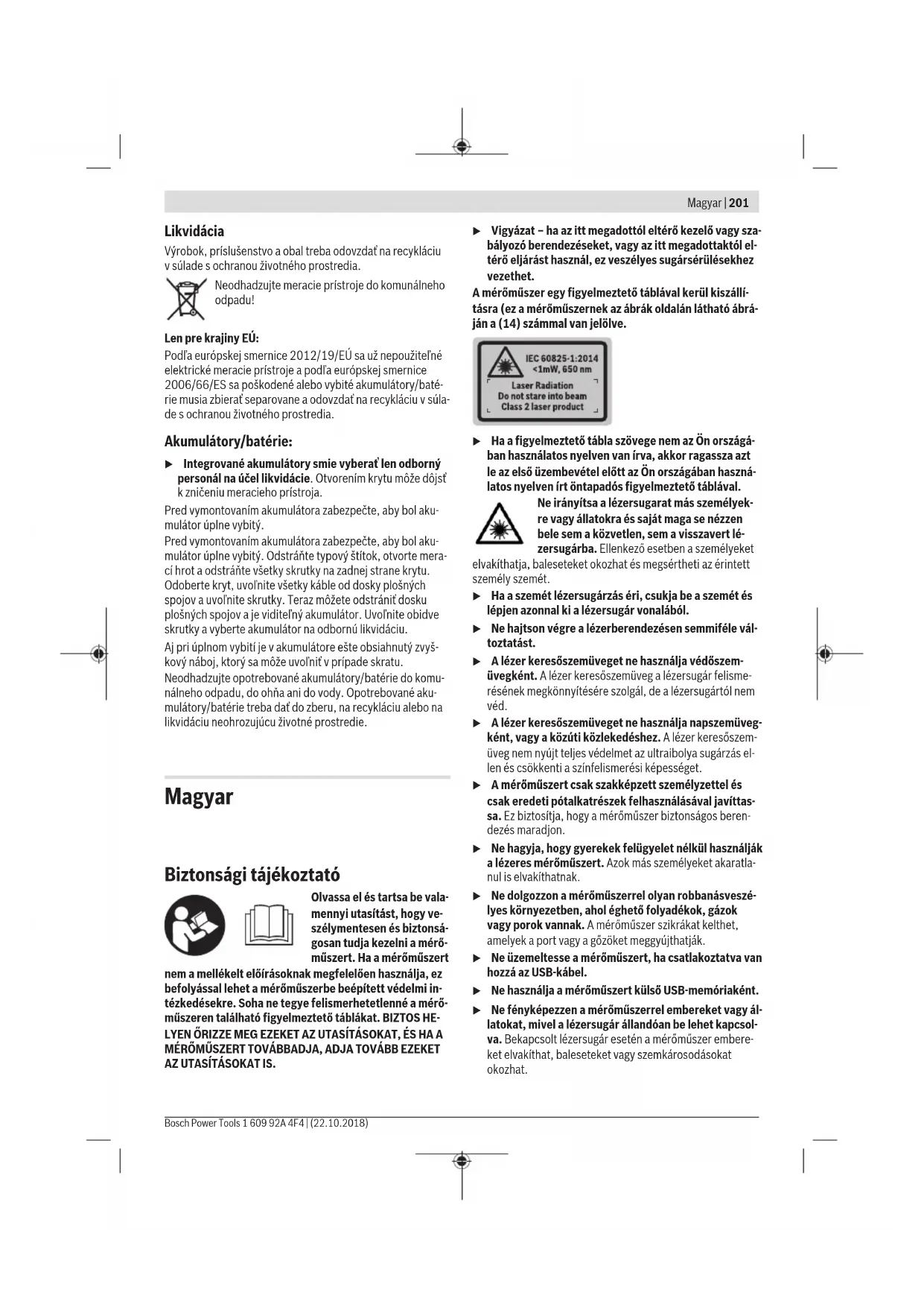 Výpočet rozdeľte na čias- tkové kroky. Zobrazenie „CAL“ azobrazenie „ERROR“ na displeji Kalibrácia merania sklonu nebola uskutočnená vsprávnom poradí alebo nebola vykonaná vsprávnych polohách. Zopakujte kalibráciu podľa pokynov na displeji avNávo- de na používanie. Plochy použité na kalibráciu neboli nastavené presne do vodorovnej roviny alebo presne do zvislej roviny. Zopakujte kalibráciu na vodorovnej, resp. zvislej ploche aprekontrolujte prípadne tieto plochy vopred pomocou vodováhy. Merací prístroj sa pri stlačení niektorého tlačidla pohol alebo naklopil. Zopakujte kalibráciu apodrž- te merací prístroj počas stlá- čania tlačidla na ploche tak, aby sa nepohol. Ukazovateľ stavu nabitia akumulátora (g), výstraha tep- loty azobrazenie „ERROR“ na displeji Teploty meracieho prístroja mimo povoleného rozsahu teploty pri nabíjaní. Počkajte, kým sa dosiahne prípustný rozsah teploty pri nabíjaní. Ukazovateľ stavu nabitia akumulátora (g), zobrazenie „ERROR“ na displeji Slovenčina | 199 Bosch Power Tools 1 609 92A 4F4 | (22.10.2018)200 | Slovenčina 1 609 92A 4F4 | (22.10.2018) Bosch Power Tools Príčina Pomoc Nabíjacie napätie akumuláto- ra nie je správne. Skontrolujte, či bol zástrč- kový spoj vytvorený korektne ači nabíjačka správne fungu- je. Ak symbol prístroja bliká, je akumulátor poškodený atreba ho dať vymeniť do servisnej autorizovanej opravovne Bosch. Výsledok merania nepravdepodobný Cieľová plocha neodráža jednoznačne (napr. sklo, voda). Zakryte cieľové plochy. Výstup laserového lúča (18), príp. prijímacia šošovka (20), príp. kamera (19) sú zakryté. Výstup laserového lúča (18), prijímaciu šošovku (20), príp. kameru (19) nechajte odkryté. Nastavená nesprávna refe- renčná rovina. Zvoľte referenčnú rovinu vhodne kmeraniu. Prekážka vpriebehu lasero- vého lúča. Laserový bod sa musí celý nachádzať na cieľovej ploche. Bluetooth® sa nedá aktivovať Akumulátor je slabý. Nabite akumulátor mera- cieho prístroja. Nie je spojenie Bluetooth® Porucha spojenia Bluetooth® Bluetooth® na meracom prí- stroji akoncovom mobilnom zariadení vypnite aznova za- pnite. Skontrolujte aplikáciu vo va- šom mobilnom koncovom za- riadení. Skontrolujte, či je funkcia Bluetooth® na vašom mera- com prístroji amobilnom koncovom zariadení aktivo- vaná. Skontrolujte, či vaše mobilné koncové zariadenie nie je preťažené. Skráťte vzdialenosť medzi meracím prístrojom avaším mobilným koncovým za- riadením. Zabráňte prekážkam (napr. železobetón, kovové dvere) medzi meracím prístrojom avaším mobilným koncovým zariadením. Udržiavajte bez- pečný odstup od zdrojov elektromagnetického rušenia (napr. vysielačov WLAN). Príčina Pomoc Prenos údajov prostredníctvom rozhrania USB nie je možný Mikro USB kábel Skontrolujte, či je mikro USB kábel správne apevne zasu- nutý. Skontrolujte, či mikro USB kábel nie je poškodený. Merací prístroj kontroluje správnosť funkcie pri každom meraní. Ak sa zistí porucha, displej zo- brazuje už len vedľajší symbol. Vtakomto prípade, alebo ak vyššie uvedené opatrenia ne- vedia odstrániť poruchu, doručte merací prí- stroj prostredníctvom svojho predajcu autorizovanému ser- visnému stredisku Bosch. Údržba aservis Údržba ačistenie Udržiavajte svoj merací prístroj vždy včistote. Neponárajte merací prístroj do vody ani do iných kvapalín. Znečistenia utrite vlhkou mäkkou handričkou. Nepoužívajte žiadne čistiace prostriedky či rozpúšťadlá. Veľmi opatrne očistite prijímaciu šošovku (20), výstup la- serového lúča (18) akameru (19): Dbajte na to, aby sa na prijímacej šošovke, výstupe laserového lúča akamere nenachádzali nečistoty. Kameru, prijímaciu šošovku avý- stupný otvor pre laserový lúč čistite len prostriedkami, ktoré sú vhodné na čistenie šošoviek fotoaparátov. Nepokúšajte sa odstraňovať nečistoty zprijímacej šošovky, výstupného ot- voru lasera alebo kamery špicatými predmetmi aneutierajte ich cez ne (nebezpečenstvo poškriabania). Vprípade potreby opravy zašlite merací prístroj vochran- nom puzdre (24). Zákaznícka služba aporadenstvo ohľadom použitia Servisné stredisko Vám odpovie na otázky týkajúce sa opravy aúdržby Vášho produktu ako aj náhradných dielov. Rozkladové výkresy ainformácie onáhradných dieloch náj- dete tiež na: www.bosch-pt.com Vprípade otázok týkajúcich sa našich výrobkov apríslušen- stva Vám ochotne pomôže poradenský tím Bosch. Vprípade akýchkoľvek otázok aobjednávok náhradných súčiastok uvádzajte bezpodmienečne 10‑miestne vecné číslo uvedené na typovom štítku výrobku. Slovakia Na www.bosch-pt.sk si môžete objednať opravu vášho stroja alebo náhradné diely online. Tel.: +421 2 48 703 800 Fax: +421 2 48 703 801 E-Mail: servis.naradia@sk.bosch.com www.bosch-pt.skLikvidácia Výrobok, príslušenstvo aobal treba odovzdať na recykláciu vsúlade sochranou životného prostredia. Neodhadzujte meracie prístroje do komunálneho odpadu! Len pre krajinyEÚ: Podľa európskej smernice 2012/19/EÚ sa už nepoužiteľné elektrické meracie prístroje apodľa európskej smernice 2006/66/ES sa poškodené alebo vybité akumulátory/baté- rie musia zbierať separovane aodovzdať na recykláciu vsúla- de sochranou životného prostredia. Akumulátory/batérie: u Integrované akumulátory smie vyberať len odborný personál na účel likvidácie. Otvorením krytu môže dôjsť kzničeniu meracieho prístroja. Pred vymontovaním akumulátora zabezpečte, aby bol aku- mulátor úplne vybitý. Pred vymontovaním akumulátora zabezpečte, aby bol aku- mulátor úplne vybitý. Odstráňte typový štítok, otvorte mera- cí hrot aodstráňte všetky skrutky na zadnej strane krytu. Odoberte kryt, uvoľnite všetky káble od dosky plošných sp