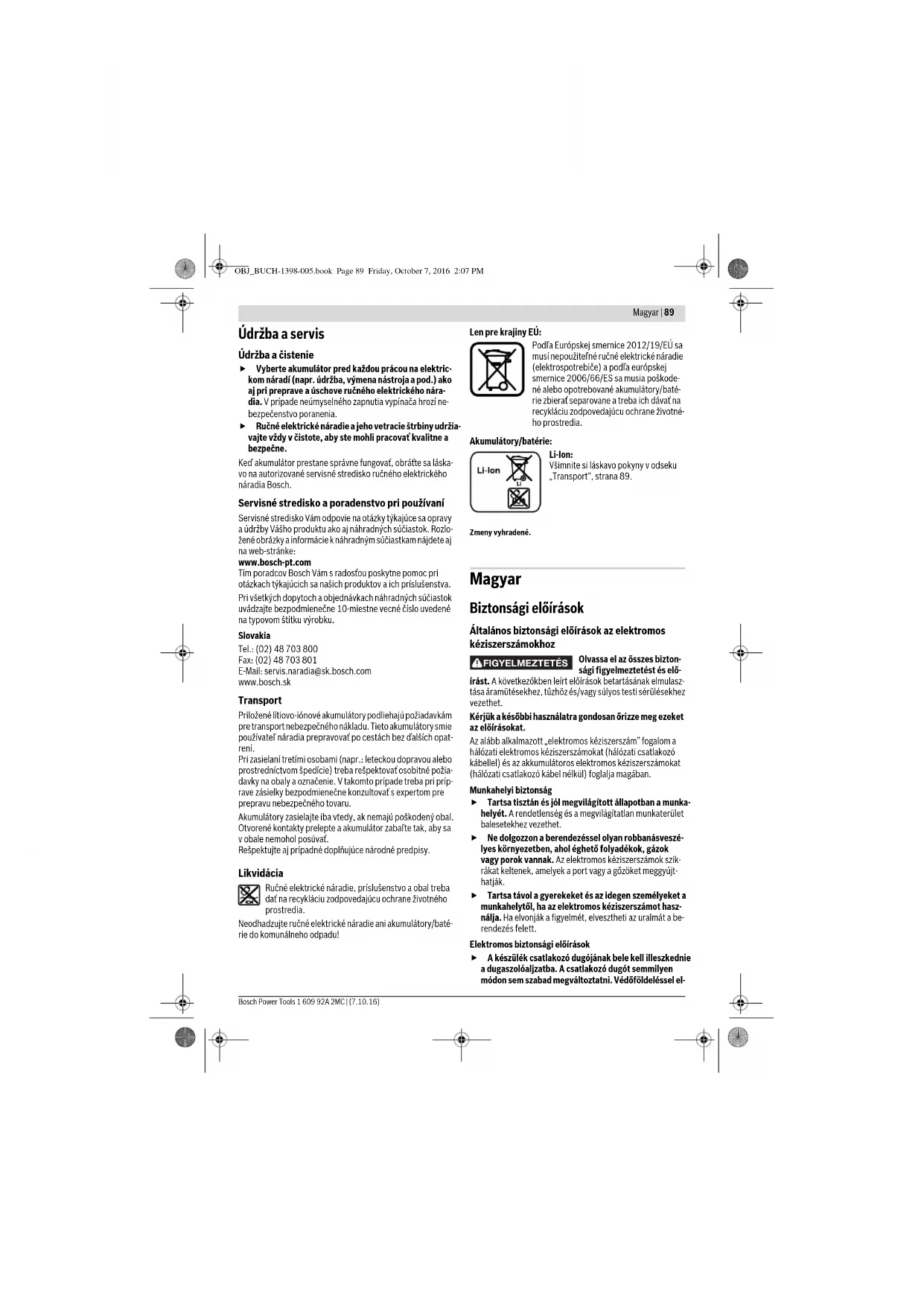- a felhasznált akkumulátortól függően Henk Becker Executive Vice President Engineering Helmut Heinzelmann Head of Product Certification PT/ECS OBJ_BUCH-1398-005.book Page 92 Friday, October 7, 2016 2:07 PMMagyar | 93 Bosch Power Tools 1 609 92A 2MC | (7.10.16) Az akkumulátor feltöltése Csak a tartozékok oldalán megadott töltőkészülékeket használja. Csak ezek a töltőkészülékek felelnek meg pon- tosan az Ön elektromos kéziszerszámában alkalmazásra kerülő Li-ion-akkumulátornak. Megjegyzés: Az akkumulátor félig feltöltve kerül kiszállításra. Az akkumulátor teljes teljesítményének biztosítására az első alkalmazás előtt töltse fel teljesen az akkumulátort a töltő- készülékben. A Li-ion-akkumulátort bármikor fel lehet tölteni, anélkül, hogy ez megrövidítené az élettartamát. A töltési folyamat megsza- kítása nem árt az akkumulátornak. A Li-ion-akkumulátort az „elektronikus cellavédelem (Electro- nic Cell Protection = ECP)” védi a mély kisüléstől. Ha az akku- mulátor kimerült, az elektromos kéziszerszámot egy védőkap- csoló kikapcsolja: Ekkor a betétszerszám nem mozog tovább. Az elektromos kéziszerszám automatikus kikapcsolása után ne nyomja tovább a be-/kikapcsolót. Ez megrongál- hatja az akkumulátort. Az akkumulátor egy NTC típusú hőmérsékletellenőrző beren- dezéssel van felszerelve, amely az akkumulátor töltését csak 0 °C és 45 °C közötti hőmérséklet esetén teszi lehetővé. Ez igen magas akkumulátor-élettartamot biztosít. Vegye figyelembe a hulladékba való eltávolítással kapcsolatos előírásokat. Az akkumulátor kivétele Az 1 akkumulátor két reteszelővállal van ellátva, amelyek meggátolják, hogy az akkumulátor a 10 akkumulátor retesze- lés feloldó gomb akaratlan megnyomásakor kiessen. Amíg az akkumulátor be van helyezve az elektromos kéziszerszámba, azt egy rugó a helyén tartja. Az 1 akkumulátor kivételéhez nyomja meg a 10 reteszelésfel- oldó gombot és húzza ki az akkumulátort előrefelé az elektro- mos kéziszerszámból. Ne erőltesse a kihúzást. Akkumulátor feltöltési kijelző (lásd az „A” ábrát) Az akkumulátor feltöltési szintjelző display három 16 zöld LED-je az 1 akkumulátor töltési szintjét mutatják. A feltöltési szintet biztonsági meggondolásokból csak álló elektromos kéziszerszám mellett lehet lekérdezni. A töltési szint kijelzéséhez nyomja meg a 15 gombot. Erre el- távolított 1 akkumulátor esetén is van lehetőség. Ha a 15 nyomógomb megnyomása után egy LED sem gyullad ki, akkor az akkumulátor hibás és ki kell cserélni. A szalagfűrészlap beszerelése/kicserélése A szalagfűrészlap be- és kiszereléséhez viseljen védő kesztyűt. A szalagfűrészlap megérintése sérülésveszél- lyel jár. Viseljen mindig védőszemüveget. Egy védőszemüveg csökkenti a személyes sérülések kockázatát. A szalagfűrészlap kiválasztása A javasolt szalagfűrészlapok áttekintése ezen útmutató végén található. A szalagfűrészlap beszerelése (lásd a „B” –„E” ábrát) Lazítsa ki mindkét 12 csavart és vegye le a 11 fedeleket. For- gassa el a forgásirányban ütközésig 180°-ra a 8 kart. Vezesse be a 6 szalagfűrészlapot egymás után a 13 fűrészlap- megvezetésekbe. A fűrészlap hátsó oldalának meg kell érinte- nie a 13 fűrészlapmegvezetésekben található csapágyakat. Vezesse a 6 szalagfűrészlapot egymás után mindkét 17 görgő körül. Forgassa el a forgásirányban ütközésig 180°-ra a 8 kart. El- lenőrizze, hogy a 6 szalagfűrészlap megfelelően helyezkedik- e el a két 17 görgő körül. Szerelje fel a 11 fedeleket és húzza meg szorosra mindkét 12 csavart. Ellenőrizze a 6 szalagfűrészlap helyes illeszkedését. Többször egymás után kapcsolja rövid időre be majd ki az elektromos kéziszerszámot. Egy helytelenül felszerelt szalagfűrészlap leválhat és sérüléseket okozhat. Pótfogantyú (lásd az „F” ábrát) Az elektromos kéziszerszámot csak az arra felszerelt 9 pótfogantyúval együtt szabad használni. Csavarja be a pótfogantyút a házon található megfelelő 18 menetes furatba. Por- és forgácselszívás Az ólomtartalmú festékrétegek, egyes fafajták, ásványok és fémek pora egészségkárosító hatású lehet. A poroknak a kezelő vagy a közelben tartózkodó személyek által törté- nő megérintése vagy belégzése allergikus reakciókhoz és/vagy a légutak megbetegedését vonhatja maga után. Egyes faporok, például tölgy- és bükkfaporok rákkeltő ha- tásúak, főleg ha a faanyag kezeléséhez más anyagok is van- nak bennük (kromát, favédő vegyszerek). A készülékkel azbesztet tartalmazó anyagokat csak szakembereknek szabad megmunkálniuk. – Gondoskodjon a munkahely jó szellőztetéséről. – Ehhez a munkához célszerű egy P2 szűrőosztályú por- védő álarcot használni. A feldolgozásra kerülő anyagokkal kapcsolatban tartsa be az adott országban érvényes előírásokat. Gondoskodjon arról, hogy a munkahelyén ne gyűlhes- sen össze por. A porok könnyen meggyulladhatnak. Üzemeltetés Üzembe helyezés Az akkumulátor beszerelése Csak az Ön elektromos kéziszerszámának a típustáblá- ján megadott feszültségű, eredeti Bosch-gyártmányú Li-ion-akkumulátort használjon. Más akkumulátorok használata személyi sérüléseket és tüzet okozhat. Tolja be a megtöltött 1 akkumulátort előlről az elektromos ké- ziszerszámba. Nyomja bele teljesen a feltöltött akkumulátort LED Kapacitás Folyamatos fény, 3 x zöld ≥2/3 Folyamatos fény, 2 x zöld ≥1/3 Folyamatos fény, 1 x zöld <1/3 Villogó fény 1 x zöld tartalék OBJ_BUCH-1398-005.book Page 93 Friday, October 7, 2016 2:07 PM94 | Magyar 1 609 92A 2MC | (7.10.16) Bosch Power Tools az elektromos kéziszerszámba, amíg az akkumulátor bizton- ságos reteszelésre kerül. Be-