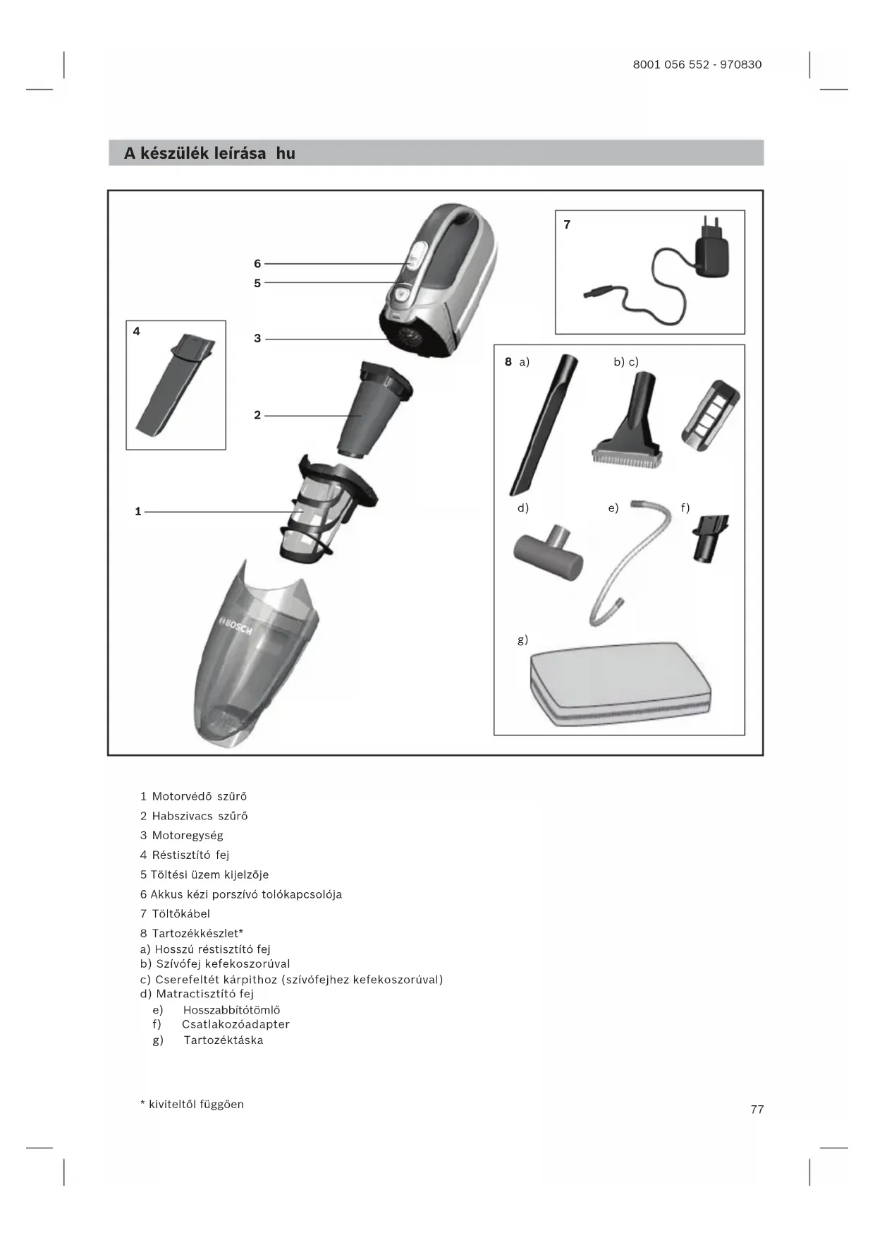 Nie stosować środków do szorowania, środków do czyszczenia szkła ani uniwersalnych środków czyszczących. Odkurzacza nigdy nie zanurzać w wodzie. Zastrzegamy sobie prawo do zmian technicznych.77 8001 056 552 - 970830 A készülék leírása hu 1 Motorvédő szűrő 2 Habszivacs szűrő 3 Motoregység 4 Réstisztító fej 5 Töltési üzem kijelzője 6 Akkus kézi porszívó tolókapcsolója 7 Töltőkábel 8 Tartozékkészlet* a) Hosszú réstisztító fej b) Szívófej kefekoszorúval c) Cserefeltét kárpithoz (szívófejhez kefekoszorúval) d) Matractisztító fej e) Hosszabbítótömlő f) Csatlakozóadapter g) Tartozéktáska