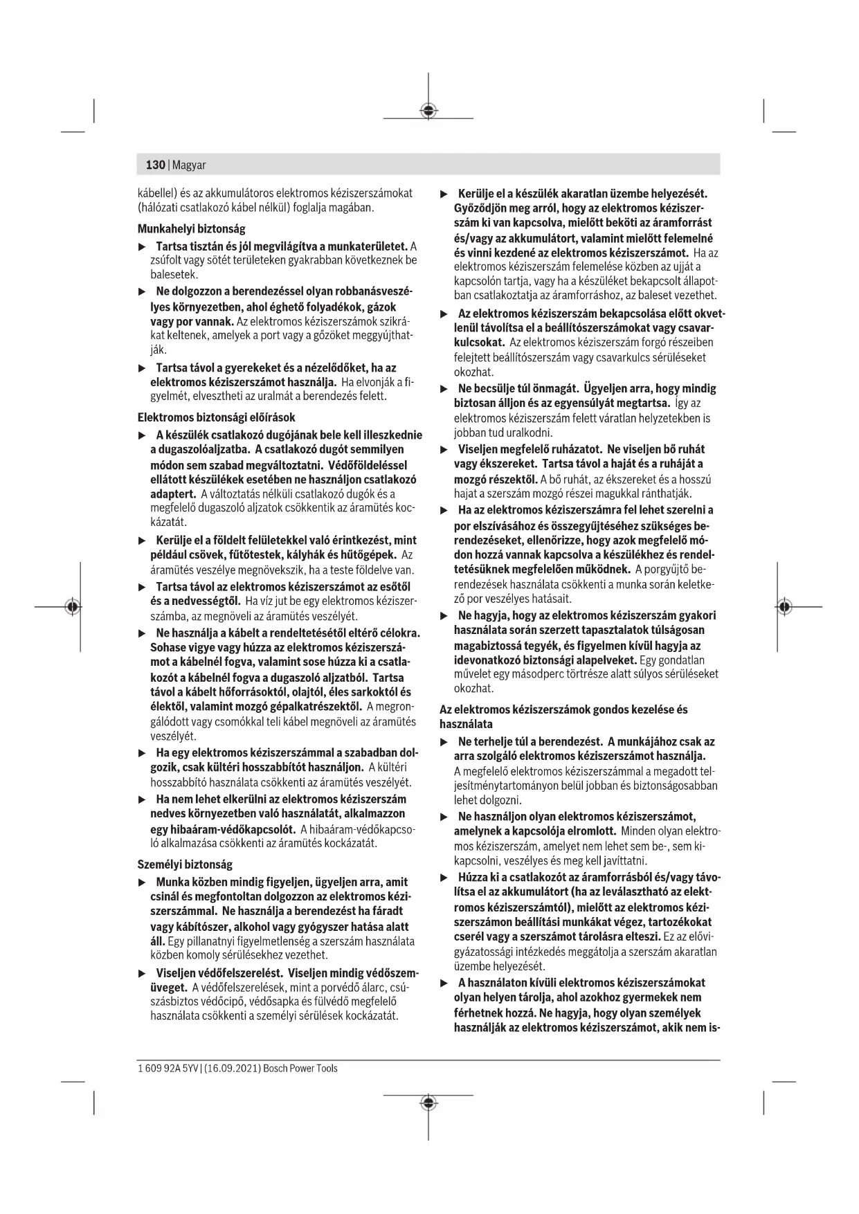Az ezen utasításokban megadott rezgésszint és zajkibocsátá- si érték egy szabványban rögzített mérési módszerrel került meghatározásra és az elektromos kéziszerszámok egymással való összehasonlítására alkalmazható. Ez az érték a rezgés- és zajkibocsátás ideiglenes becslésére is alkalmas. A megadott rezgésszint és zajkibocsátási érték az elektro- mos kéziszerszám fő alkalmazásaira vonatkozik. Ha az elekt- romos kéziszerszámot más alkalmazásokra, eltérő betétszer- számokkal vagy nem kielégítő karbantartás mellett használ- ják, a rezgésszint és a zajkibocsátási érték a fenti értékektől eltérhet. Ez az egész munkaidőre vonatkozó rezgés- és zajki- bocsátást lényegesen megnövelheti. A rezgés- és zajkibocsátás pontos megbecsüléséhez figye- lembe kell venni azokat az időszakokat is, amikor a készülék kikapcsolt állapotban van, vagy amikor be van ugyan kap- csolva, de nem kerül ténylegesen használatra. Ez az egész munkaidőre vonatkozó rezgés- és zajkibocsátást lényegesen csökkentheti. Hozzon kiegészítő biztonsági intézkedéseket a kezelőnek a rezgések hatása elleni védelmére, például: Az elektromos ké- ziszerszám és a betétszerszámok karbantartása, a kezek me- legen tartása, a munkamenetek megszervezése. Összeszerelés u Csak olyan fűrészlapokat használjon, amelyek megen- gedett sebessége magasabb az elektromos kéziszer- szám üresjárati sebességénél. Az akkumulátor feltöltése u Csak a Műszaki Adatoknál megadott töltőkészüléke- ket használja. Csak ezek a töltőkészülékek felelnek meg pontosan az Ön elektromos kéziszerszámában alkalma- zásra kerülő Li‑ion-akkumulátornak. Figyelem: Az akkumulátor részben feltöltve kerül kiszállítás- ra. Az akkumulátor teljes teljesítményének biztosítására az első alkalmazás előtt töltse fel teljesen az akkumulátort a töl- tőkészülékben. A Li‑ion-akkumulátort bármikor fel lehet tölteni, anélkül, hogy ez megrövidítené az élettartamát. A töltési folyamat megszakítása nem árt az akkumulátornak. A lithium-ionos-akkumulátort az „Electronic Cell Protection (ECP)“ védi a túl erős kisülés ellen. Ha az akkumulátor kime- rült, az elektromos kéziszerszámot egy védőkapcsoló kikap- csolja: Ekkor a betétszerszám nem mozog tovább. u Az elektromos kéziszerszám automatikus kikapcsolá- sa után ne nyomja tovább a be‑/kikapcsolót. Ez meg- rongálhatja az akkumulátort. Vegye figyelembe a hulladékba való eltávolítással kapcsola- tos előírásokat. Az akkumulátor kivétele A (9) akkumulátor két reteszelővállal van ellátva, amelyek meggátolják, hogy az akkumulátor a (8) akkumulátor rete- szelés feloldó gomb akaratlan megnyomásakor kiessen. Amíg az akkumulátor be van helyezve az elektromos kézi- szerszámba, azt egy rugó a helyén tartja. A (9) akkumulátor eltávolításához nyomja meg a (8) retesze- lés feloldó gombokat és húzza ki az akkumulátort hátrafelé az elektromos kéziszerszámból. Ne erőltesse a kihúzást. Akkumulátor töltöttségi szint kijelző Az akkumulátor töltési szint kijelző display zöld LED-jei az ak- kumulátor töltési szintjét mutatják. A töltöttségi szintet biz- tonsági okokból csak használaton kívüli elektromos kéziszer- szám esetén lehet lekérdezni. Nyomja meg a vagy a feltöltési szint kijelző gombot, hogy kijelezze a töltési szintet. Erre kivett akkumulátor ese- tén is van lehetőség. Ha az akkumulátor feltöltési szint kijelző gomb megnyomása után egy LED sem világít, az akkumulátor meghibásodott és ki kell cserélni. Akkumulátor típus: GBA 18V... LED-ek Kapacitás Tartós fény, 3× zöld 60−100% Tartós fény, 2× zöld 30−60% Tartós fény, 1× zöld 5−30% Villogó fény, 1× zöld 0−5% Akkumulátor típus: ProCORE18V... LED-ek Kapacitás Tartós fény, 5× zöld 80−100 % 1 609 92A 5YV | (16.09.2021) Bosch Power ToolsMagyar | 135 LED-ek Kapacitás Tartós fény, 4× zöld 60−80 % Tartós fény, 3× zöld 40−60 % Tartós fény, 2× zöld 20−40 % Tartós fény, 1× zöld 5−20 % Villogó fény, 1× zöld 0−5 % A körfűrészlap behelyezése / kicserélése u Az elektromos kéziszerszámon végzendő bármely munka megkezdése előtt vagye ki abból az akkumulá- tort. u A fűrészlap felszereléséhez viseljen védőkesztyűt. A fűrészlap megérintése sérülésveszéllyel jár. u Csak legalább 130mm és legfeljebb 136mm átmérőjű fűrészlapokat használjon. u Semmiképpen se használjon betétszerszámként csi- szolótárcsákat. u Csak olyan fűrészlapokat használjon, amelyek megfe- lelnek az ezen Kezelési Utasításban és az elektromos kéziszerszámon megadott adatoknak és amelyeket az EN847‑1 szabványnak megfelelően ellenőriztek és megfelelőnek találtak. A fűrészlap kijelölése A javasolt fűrészlapok áttekintése ezen útmutató végén talál- ható. A fűrészlap leszerelése (lásd a A ábrát) Az elektromos kéziszerszámot a szerszámcseréhez a legcél- szerűbb a motorház frontoldalára fektetni. – Nyomja meg és tartsa megnyomva a (1) orsó-reteszelő gombot. u A (1) tengely reteszelőgombot csak teljesen nyugalmi állapotban lévő fűrészorsó esetén szabad megnyomni. Ellenkező esetben az elektromos kéziszerszám megrongá- lódhat. – Csavarja ki a (5) belső hatlapos kulccsal az ➊ forgásirány- ban a (16) szorítócsavart. – Forgassa vissza a (21) lengő védőburkolatot és tartsa eb- ben a helyzetben fogva. – Vegye le a (17) befogó karimát és a (18) fűrészlapot a (20) fűrészorsóról. A fűrészlap felszerelése (lásdaAábrát) Az elektromos kéziszerszámot a szerszámcseréhez a legcél- szerűbb a motorház frontoldalára fektetni. – Tisztítsa meg a(18)fűrészlapot és valamennyi felszere- lésre kerülő befogó alkatrészt. – Forgassa vissza a(21)lengő védőbúr