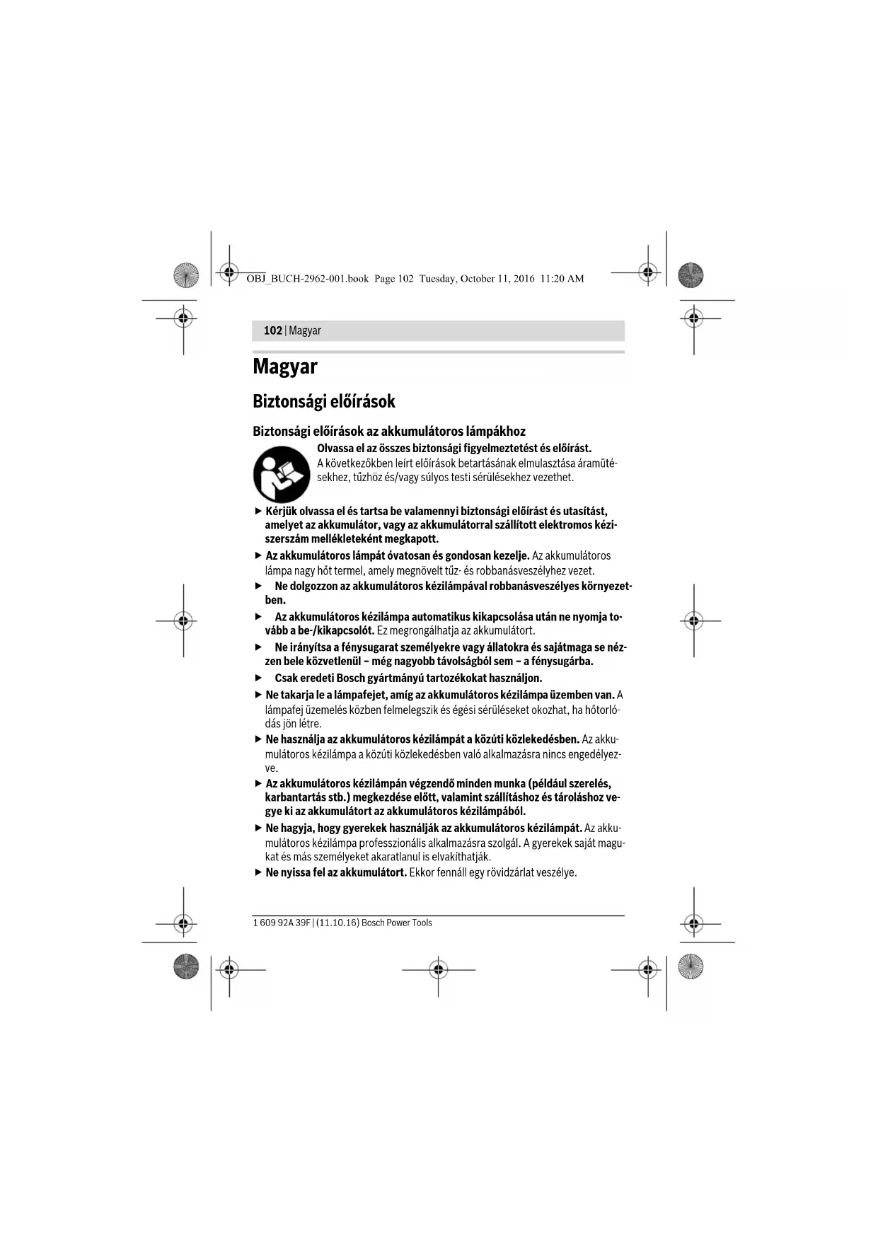 0...+45 –20...+50 Javasolt akkumulátorok GBA 10,8V.. GBA 12V... Javasolt töltőkészülékek AL 11.. CV GAL 12.. CV A megvilágított tárgyak színvisszadása hamis lehet.* a felhasznált akkumulátortól függően** korlátozott teljesítmény <0 °C hőmérsékletek esetén OBJ_BUCH-2962-001.book Page 104 Tuesday, October 11, 2016 11:20 AMMagyar | 105 Bosch Power Tools 1 609 92A 39F | (11.10.16) Az akkumulátoros kézilámpa automatikus kikapcsolása után ne nyomja to- vább a be-/kikapcsolót. Ez megrongálhatja az akkumulátort. Az 5 akkumulátor kivételéhez nyomja meg a 4 reteszelésfeloldó gombot és húzza ki az akkumulátort az akkumulátoros lámpából. Ne erőltesse a kihúzást. Vegye figyelembe a hulladékba való eltávolítással kapcsolatos előírásokat. Üzemeltetés Üzembevétel Az akkumulátor beszerelése Tegye be az 5 akkumulátort az akkumulátorkosárba, amíg az érezhetően bepattan a helyére és egy síkba kerül a felülettel. Be- és kikapcsolás Az akkumulátoros kézilámpa üzembe helyezéséhez nyomja be a 2 be-/kikapcsolót. Az akkumulátoros kézilámpa kikapcsolásához nyomja meg ismét a 2 be-/kikapcso- lót. Az energia megtakarítására az akkumulátoros lámpát csak akkor kapcsolja be, ha használja. Munkavégzési tanácsok Akasztó horog (lásd az „A” ábrát) A 3 akasztó horoggal hozzá lehet erősíteni az akkumulátoros lámpát valamilyen tárgy- hoz. Az akkumulátoros lámpa helyzetének beállítása (lásd a „B” ábrát) Az akkumulátoros lámpát álló helyzetben, felakasztva vagy fekvő helyzetben lehet használni. A hatszögletű kialakítás segítségével a fényt az alkalmazási célnak megfele- lően lehet beállítani. Karbantartás és szerviz Karbantartás és tisztítás Ha az akkumulátor már nem működik, forduljon egy Bosch elektromos kéziszerszám Vevőszolgálathoz. Az akkumulátoros kézilámpa nem igényel karbantartást és nincs benne olyan alkat- rész, amelyet ki kellene cserélni, vagy karbantartási munkát kellene végezni rajta. OBJ_BUCH-2962-001.book Page 105 Tuesday, October 11, 2016 11:20 AM106 | Magyar 1 609 92A 39F | (11.10.16) Bosch Power Tools A fényforrást nem lehet kicserélni. Ha a fényforrás elromlott, az egész akkumulátoros lámpát ki kell cserélni. Az akkumulátoros kézilámpa műanyag üvegét csak egy puha, száraz kendővel tisztítsa meg, hogy elkerülje a megrongálódásokat. Ne használjon tisztító- vagy oldószereket. Vevőszolgálat és használati tanácsadás A Vevőszolgálat választ ad a termékének javításával és karbantartásával, valamint a pótalkatrészekkel kapcsolatos kérdéseire. A tartalékalkatrészekkel kapcsolatos rob- bantott ábrák és egyéb információk a címen találhatók: www.bosch-pt.com A Bosch Használati Tanácsadó Team szívesen segít, ha termékeinkkel és azok tartozé- kaival kapcsolatos kérdései vannak. Ha kérdései vannak vagy pótalkatrészeket szeretne rendelni, okvetlenül adja meg a termék típustábláján található 10-jegyű cikkszámot. Magyarország Robert Bosch Kft. 1103 Budapest Gyömrői út. 120. A www.bosch-pt.hu oldalon online megrendelheti készülékének javítását. Tel.: (061) 431-3835 Fax: (061) 431-3888 Szállítás A termékben található lithium-ion-akkumulátorokra a veszélyes árukra vonatkozó elő- írások érvényesek. A felhasználók az akkumulátorokat a közúti szállításban minden további nélkül szállíthatják. Ha az akkumulátorok szállításával harmadik személyt (például: légi vagy egyéb szállító vállalatot) bíznak meg, akkor figyelembe kell venni a csomagolásra és a megjelölésre vonatkozó különleges követelményeket. Ebben az esetben a küldemény előkészítésé- be be kell vonni egy veszélyes áru szakembert. Csak akkor küldje el az akkumulátort, ha a háza nincs megrongálódva. Ragassza le a nyitott érintkezőket és csomagolja be úgy az akkumulátort, hogy az a csomagoláson belül ne mozoghasson. Vegye figyelembe az adott országon belüli, az előbbieknél esetleg szigorúbb helyi elő- írásokat. OBJ_BUCH-2962-001.book Page 106 Tuesday, October 11, 2016 11:20 AMMagyar | 107 Bosch Power Tools 1 609 92A 39F | (11.10.16) Hulladékkezelés Az akkumulátoros lámpákat, az akkumulátorokat, a tartozékokat és a csoma- golást a környezetvédelmi szempontoknak megfelelően kell újrafelhasználás- ra előkészíteni. Ne dobja ki az akkumulátoros lámpákat és az akkumulátorokat/elemeket a háztartási szemétbe! Csak az EU-tagországok számára: Az elhasznált villamos és elektronikus berendezésekre vonatkozó 2012/19/EU európai irányelvnek és az elromlott vagy elhasznált akkumulátorokra/elemekre vonatkozó 2006/66/EK európai irány- elvnek megfelelően a már nem használható akkumulátoros lámpá- kat és akkumulátorokat/elemeket külön össze kell gyűjteni és a kör- nyezetvédelmi szempontoknak megfelelően kell újrafelhasználásra leadni. Akkumulátorok/elemek: Li-ion: Kérjük vegye figyelembe az „Szállítás” fejezetben, a 106 olda- lon leírtakat. A változtatások joga fenntartva. OBJ_BUCH-2962-001.book Page 107 Tuesday, October 11, 2016 11:20 AM108 | Русский 1 609 92A 39F | (11.10.16) Bosch Power Tools