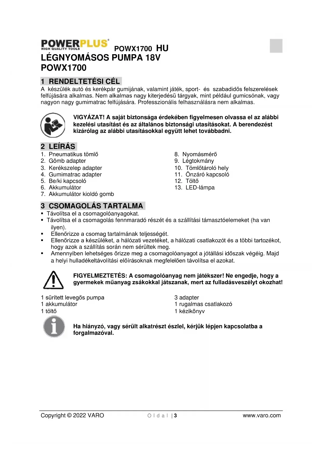 - Amennyiben lehetséges őrizze meg a csomagolóanyagot a jótállási időszak végéig. Majd a helyi hulladékeltávolítási előírásoknak megfelelően távolítsa el azokat. FIGYELMEZTETÉS: A csomagolóanyag nem játékszer! Ne engedje, hogy a gyermekek műanyag zsákokkal játszanak, mert az fulladásveszélyt okozhat! 1 sűrített levegős pumpa 1 akkumulátor 1 töltő 3 adapter 1 rugalmas csatlakozó 1 kézikönyv Ha hiányzó, vagy sérült alkatrészt észlel, kérjük lépjen kapcsolatba a forgalmazóval.POWX1700 HU Copyright © 2022 VARO O l d a l | 4 www.varo.com 4 JELZÉSEK A jelen kezelési utasításban és/vagy a készüléken a következő jelzéseket alkalmaztuk: