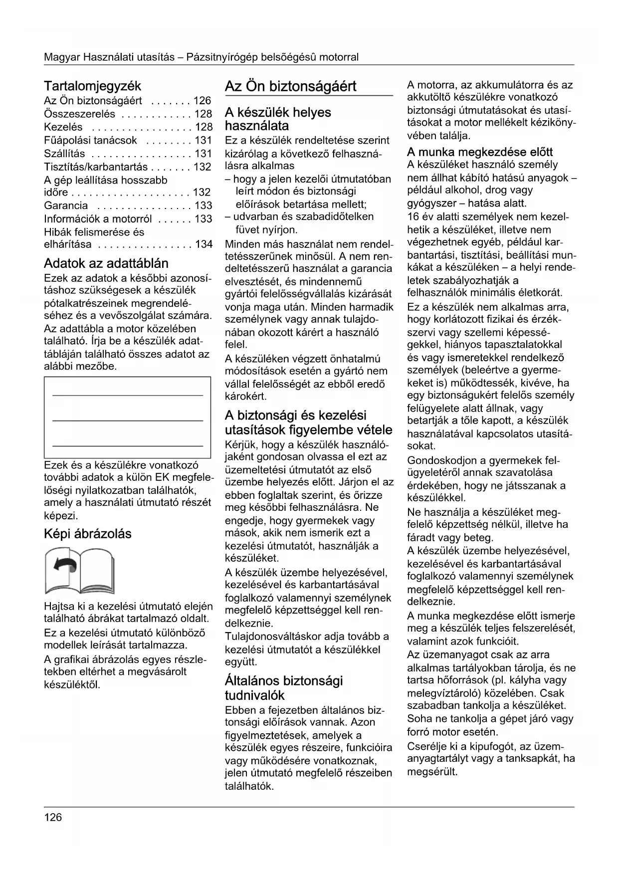 - Hibák felismerése és elhárítása Adatok az adattáblán Ezek az adatok a későbbi azonosí- táshoz szükségesek a készülék pótalkatrészeinek megrendelé- séhez és a vevőszolgálat számára. Az adattábla a motor közelében található. Írja be a készülék adat- tábláján található összes adatot az alábbi mezőbe. Ezek és a készülékre vonatkozó további adatok a külön EK megfele- lőségi nyilatkozatban találhatók, amely a használati útmutató részét képezi. Képi ábrázolás Hajtsa ki a kezelési útmutató elején található ábrákat tartalmazó oldalt. Ez a kezelési útmutató különböző modellek leírását tartalmazza. A grafikai ábrázolás egyes részle- tekben eltérhet a megvásárolt készüléktől. Az Ön biztonságáért A készülék helyes használata Ez a készülék rendeltetése szerint kizárólag a következő felhaszná- lásra alkalmas – hogy a jelen kezelői útmutatóban leírt módon és biztonsági előírások betartása mellett; – udvarban és szabadidőtelken füvet nyírjon. Minden más használat nem rendel- tetésszerűnek minősül. A nem ren- deltetésszerű használat a garancia elvesztését, és mindennemű gyártói felelősségvállalás kizárását vonja maga után. Minden harmadik személynek vagy annak tulajdo- nában okozott kárért a használó felel. A készüléken végzett önhatalmú módosítások esetén a gyártó nem vállal felelősségét az ebből eredő károkért. A biztonsági és kezelési utasítások figyelembe vétele Kérjük, hogy a készülék használó- jaként gondosan olvassa el ezt az üzemeltetési útmutatót az első üzembe helyezés előtt. Járjon el az ebben foglaltak szerint, és őrizze meg későbbi felhasználásra. Ne engedje, hogy gyermekek vagy mások, akik nem ismerik ezt a kezelési útmutatót, használják a készüléket. A készülék üzembe helyezésével, kezelésével és karbantartásával foglalkozó valamennyi személynek megfelelő képzettséggel kell ren- delkeznie. Tulajdonosváltáskor adja tovább a kezelési útmutatót a készülékkel együtt. Általános biztonsági tudnivalók Ebben a fejezetben általános biz- tonsági előírások vannak. Azon figyelmeztetések, amelyek a készülék egyes részeire, funkcióira vagy működésére vonatkoznak, jelen útmutató megfelelő részeiben találhatók. A motorra, az akkumulátorra és az akkutöltő készülékre vonatkozó biztonsági útmutatásokat és utasí- tásokat a motor mellékelt kéziköny- vében találja. A munka megkezdése előtt A készüléket használó személy nem állhat kábító hatású anyagok – például alkohol, drog vagy gyógyszer – hatása alatt. 16 év alatti személyek nem kezel- hetik a készüléket, illetve nem végezhetnek egyéb, például kar- bantartási, tisztítási, beállítási mun- kákat a készüléken – a helyi rende- letek szabályozhatják a felhasználók minimális életkorát. Ez a készülék nem alkalmas arra, hogy korlátozott fizikai és érzék- szervi vagy szellemi képessé- gekkel, hiányos tapasztalatokkal és vagy ismeretekkel rendelkező személyek (beleértve a gyerme- keket is) működtessék, kivéve, ha egy biztonságukért felelős személy felügyelete alatt állnak, vagy betartják a tőle kapott, a készülék használatával kapcsolatos utasítá- sokat. Gondoskodjon a gyermekek fel- ügyeletéről annak szavatolása érdekében, hogy ne játsszanak a készülékkel. Ne használja a készüléket meg- felelő képzettség nélkül, illetve ha fáradt vagy beteg. A készülék üzembe helyezésével, kezelésével és karbantartásával foglalkozó valamennyi személynek megfelelő képzettséggel kell ren- delkeznie. A munka megkezdése előtt ismerje meg a készülék teljes felszerelését, valamint azok funkcióit. Az üzemanyagot csak az arra alkalmas tartályokban tárolja, és ne tartsa hőforrások (pl. kályha vagy melegvíztároló) közelében. Csak szabadban tankolja a készüléket. Soha ne tankolja a gépet járó vagy forró motor esetén. Cserélje ki a kipufogót, az üzem- anyagtartályt vagy a tanksapkát, ha megsérült.Használati utasítás – Pázsitnyírógép belsõégésû motorral Magyar p. 134
