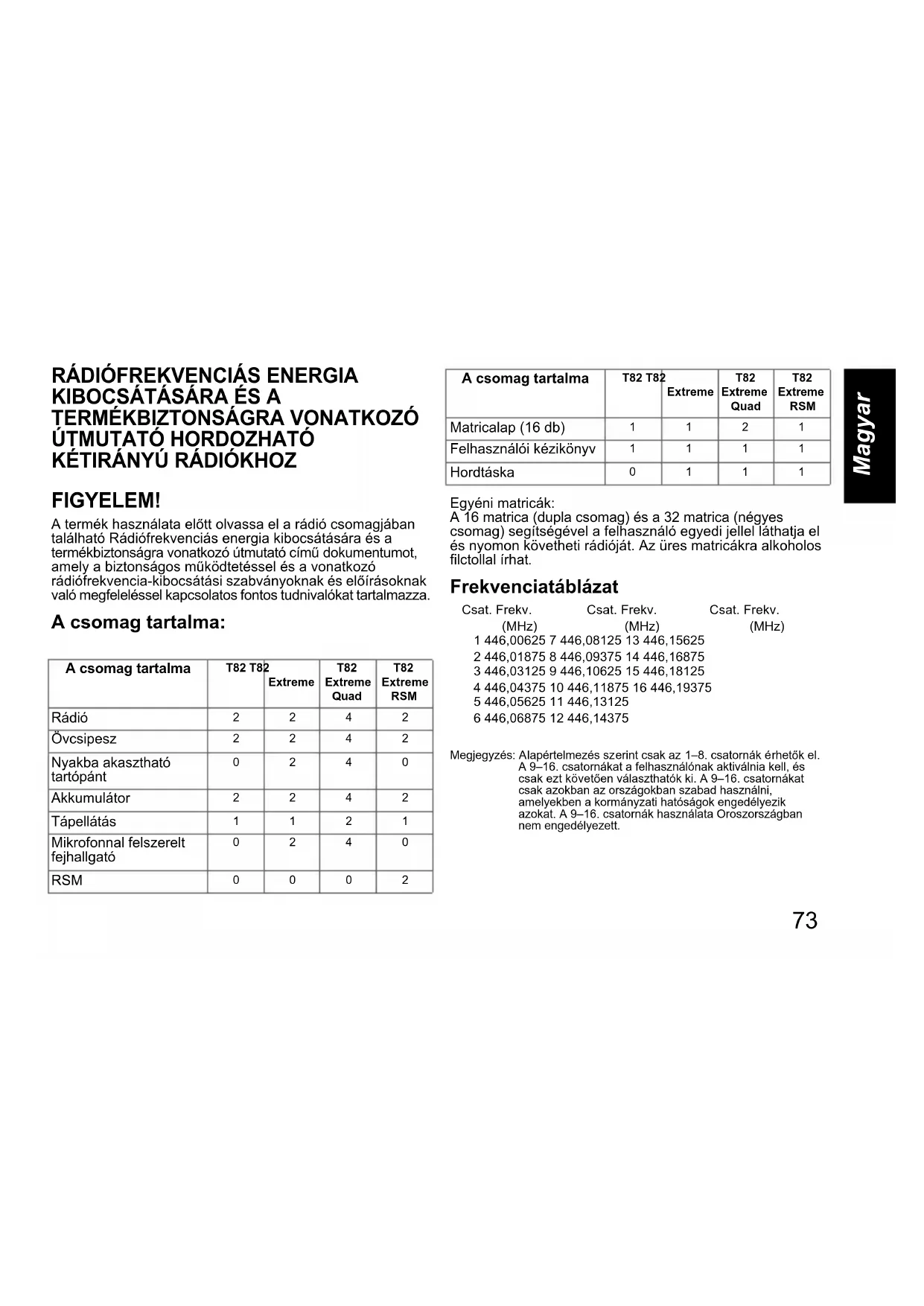 FIGYELEM! A termék használata előtt olvassa el a rádió csomagjában található Rádiófrekvenciás energia kibocsátására és a termékbiztonságra vonatkozó útmutató című dokumentumot, amely a biztonságos működtetéssel és a vonatkozó rádiófrekvencia-kibocsátási szabványoknak és előírásoknak való megfeleléssel kapcsolatos fontos tudnivalókat tartalmazza. A csomag tartalma: Egyéni matricák: A 16 matrica (dupla csomag) és a 32 matrica (négyes csomag) segítségével a felhasználó egyedi jellel láthatja el és nyomon követheti rádióját. Az üres matricákra alkoholos filctollal írhat. Frekvenciatáblázat Megjegyzés: Alapértelmezés szerint csak az 1–8. csatornák érhetők el. A 9–16. csatornákat a felhasználónak aktiválnia kell, és csak ezt követően választhatók ki. A 9–16. csatornákat csak azokban az országokban szabad használni, amelyekben a kormányzati hatóságok engedélyezik azokat. A 9–16. csatornák használata Oroszországban nem engedélyezett. A csomag tartalma T82 T82 Extreme T82 Extreme Quad T82 Extreme RSM Rádió