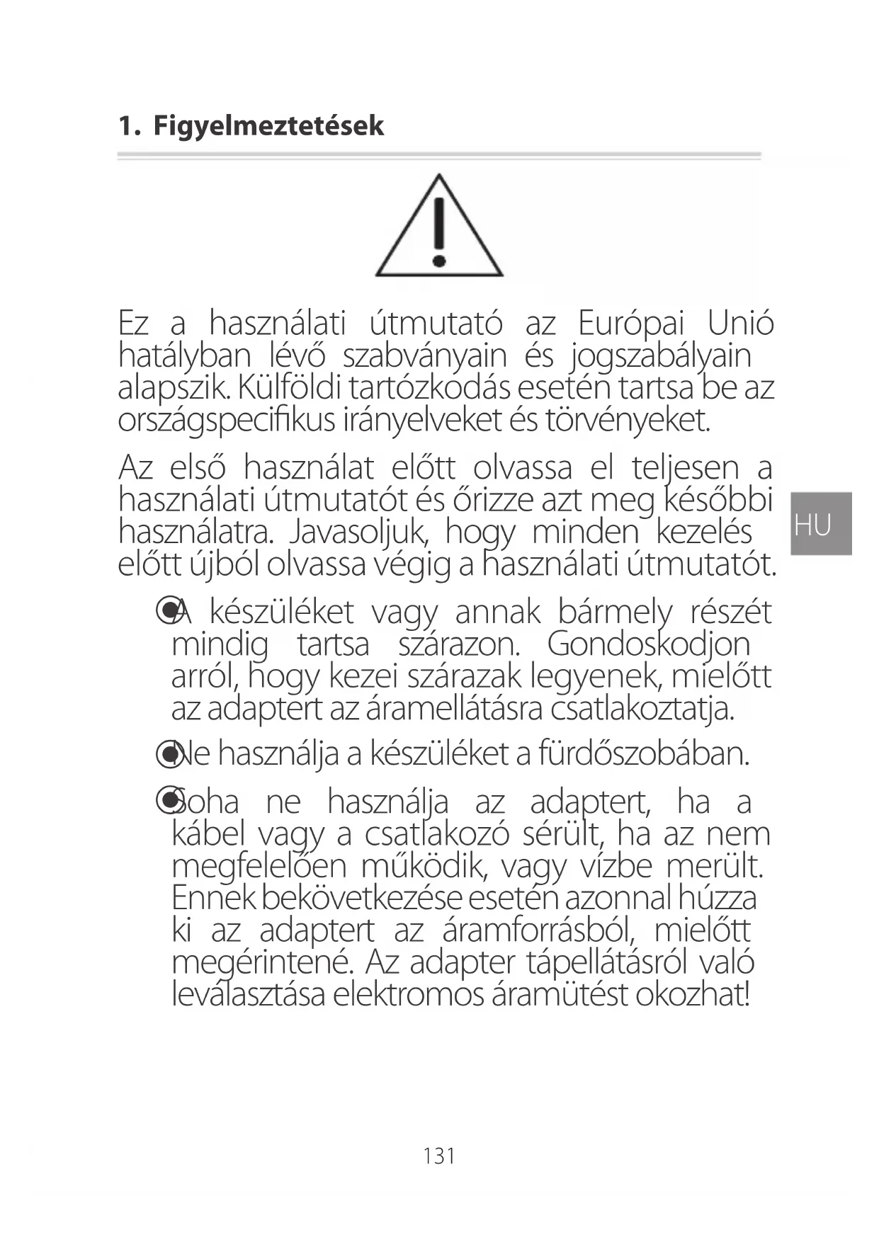 A keszüléket vagy annak barmely részét mindig tartsa szárazon. Gondoskodjon arról, hogy kezei szárazak legyenek, mielótt az adaptert az aramellatásra csatlakoztatja.