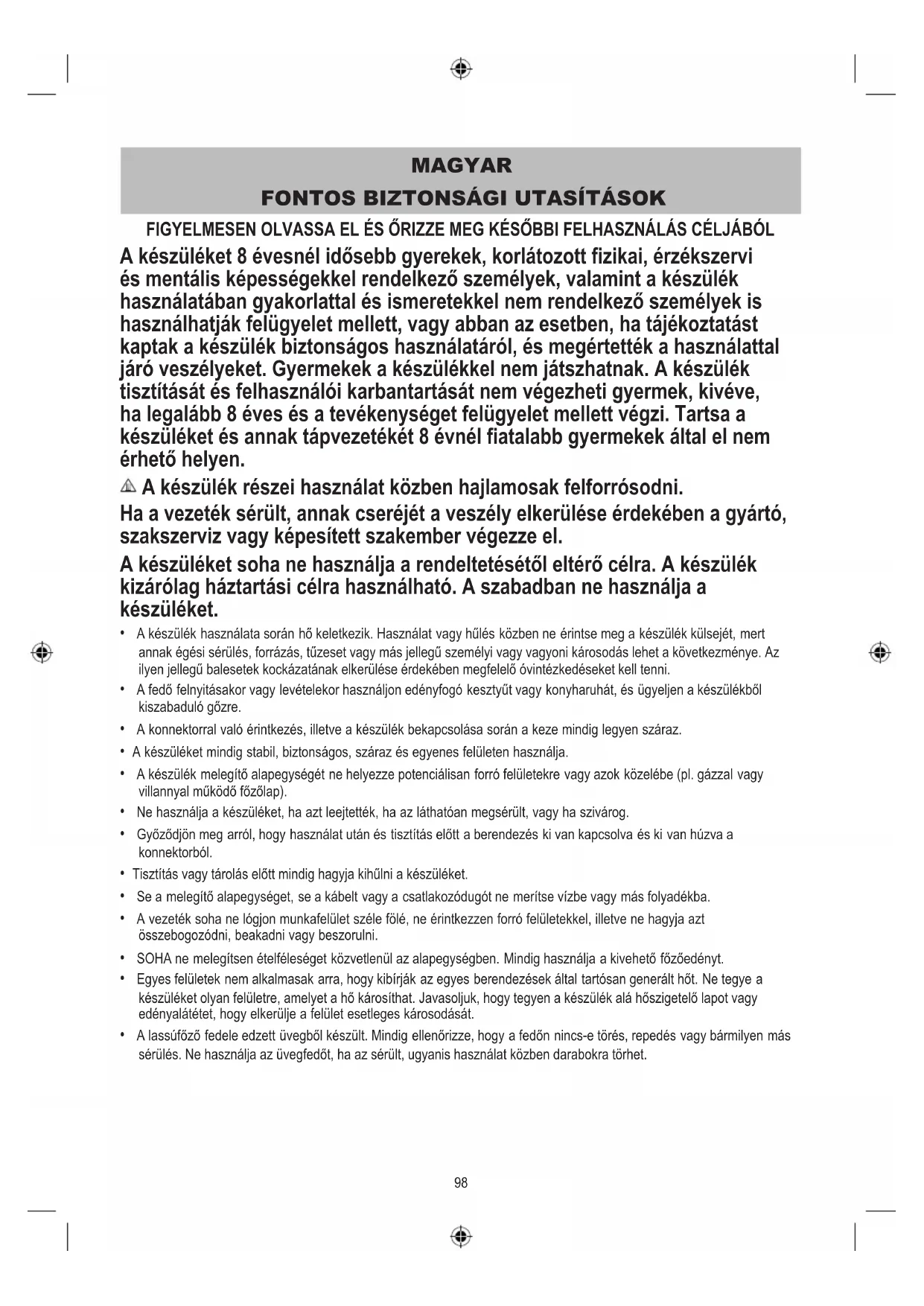 FIGYELMESEN OLVASSA EL ÉS ŐRIZZE MEG KÉSŐBBI FELHASZNÁLÁS CÉLJÁBÓL A készüléket 8 évesnél idősebb gyerekek, korlátozott fizikai, érzékszervi és mentális képességekkel rendelkező személyek, valamint a készülék használatában gyakorlattal és ismeretekkel nem rendelkező személyek is használhatják felügyelet mellett, vagy abban az esetben, ha tájékoztatást kaptak a készülék biztonságos használatáról, és megértették a használattal járó veszélyeket. Gyermekek a készülékkel nem játszhatnak. A készülék tisztítását és felhasználói karbantartását nem végezheti gyermek, kivéve, ha legalább 8 éves és a tevékenységet felügyelet mellett végzi. Tartsa a készüléket és annak tápvezetékét 8 évnél fiatalabb gyermekek által el nem érhető helyen. A készülék részei használat közben hajlamosak felforrósodni. Ha a vezeték sérült, annak cseréjét a veszély elkerülése érdekében a gyártó, szakszerviz vagy képesített szakember végezze el. A készüléket soha ne használja a rendeltetésétől eltérő célra. A készülék kizárólag háztartási célra használható. A szabadban ne használja a készüléket.