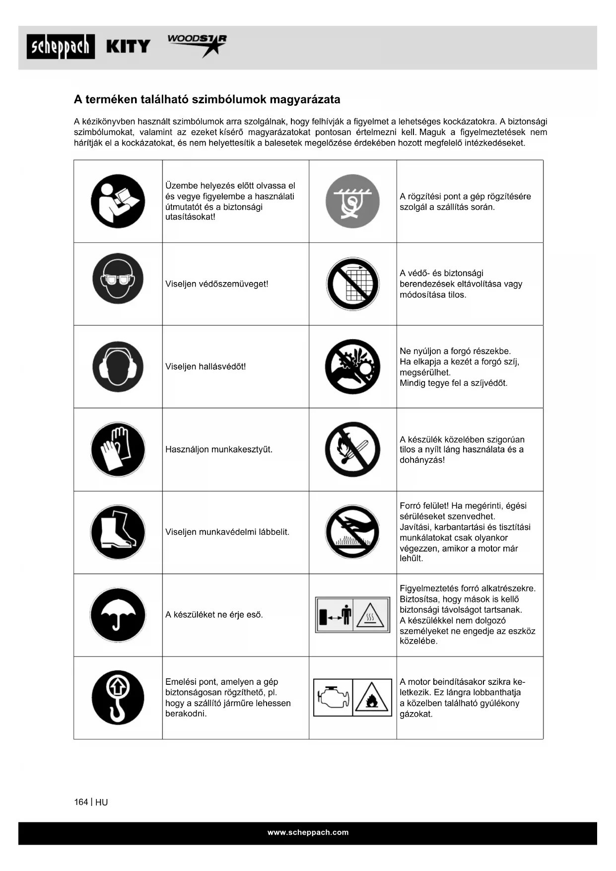 A terméken található szimbólumok magyarázata A kézikönyvben használt szimbólumok arra szolgálnak, hogy felhívják a gyelmet a lehetséges kockázatokra. A biztonsági szimbólumokat, valamint az ezeket kísérő magyarázatokat pontosan értelmezni kell. Maguk a gyelmeztetések nem hárítják el a kockázatokat, és nem helyettesítik a balesetek megelőzése érdekében hozott megfelelő intézkedéseket. Üzembe helyezés előtt olvassa el és vegye gyelembe a használati útmutatót és a biztonsági utasításokat! A rögzítési pont a gép rögzítésére szolgál a szállítás során. Viseljen védőszemüveget! A védő- és biztonsági berendezések eltávolítása vagy módosítása tilos. Viseljen hallásvédőt! Ne nyúljon a forgó részekbe. Ha elkapja a kezét a forgó szíj, megsérülhet. Mindig tegye fel a szíjvédőt. Használjon munkakesztyűt. A készülék közelében szigorúan tilos a nyílt láng használata és a dohányzás! Viseljen munkavédelmi lábbelit. Forró felület! Ha megérinti, égési sérüléseket szenvedhet. Javítási, karbantartási és tisztítási munkálatokat csak olyankor végezzen, amikor a motor már lehűlt. A készüléket ne érje eső. Figyelmeztetés forró alkatrészekre. Biztosítsa, hogy mások is kellő biztonsági távolságot tartsanak. A készülékkel nem dolgozó személyeket ne engedje az eszköz közelébe. Emelési pont, amelyen a gép biztonságosan rögzíthető, pl. hogy a szállító járműre lehessen berakodni. A motor beindításakor szikra ke- letkezik. Ez lángra lobbanthatja a közelben található gyúlékony gázokat.www.scheppach.com