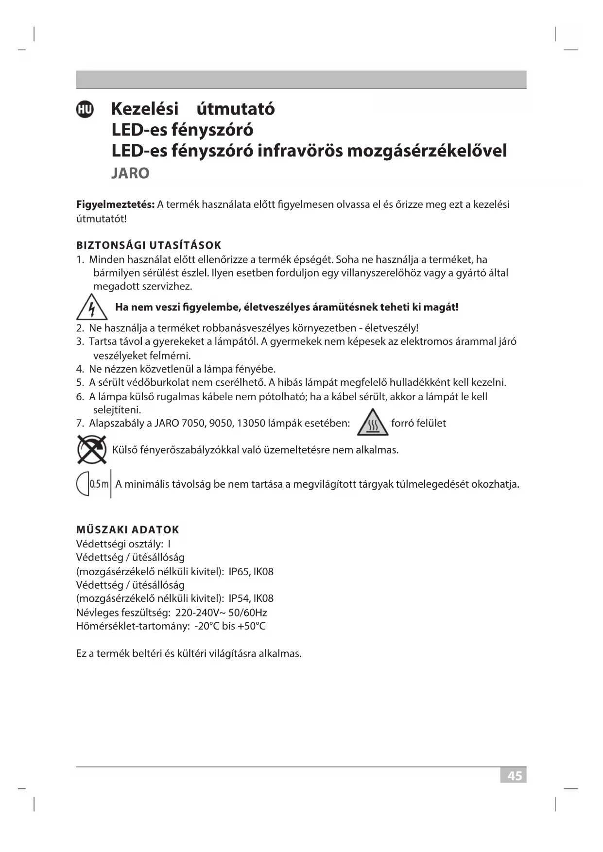 Védettségi osztály: I Védettség / ütésállóság (mozgásérzékelő nélküli kivitel): IP65, IK08 Védettség / ütésállóság (mozgásérzékelő nélküli kivitel): IP54, IK08 Névleges feszültség: 220-240V~ 50/60Hz Hőmérséklet-tartomány: -20°C bis +50°C Ez a termék beltéri és kültéri világításra alkalmas. 20P114 LED Strahler Jaro PIR 0533228 210327.indd 45 27.03.2021 16:10:514646 Kezelési útmutató JARO FELSZERELÉS ÉS CSATLAKOZTATÁS AZ ÁRAMELLÁTÁSRA 10 – 50 W lásd az ábrákat a 4., 7. és 8. oldalon