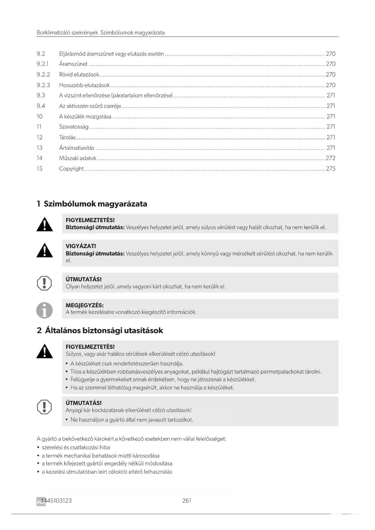 - Apárásodáselkerüléseérdekébenmindiggondoskodjonjószellőztetésről. 13 Ártalmatlanítás Acsomagolóanyagotlehetőségszerintamegfelelőszelektívhulladékgyűjtőtartályokbakellhelyezni. A termék végleges üzemen kívül helyezése esetén tájékozódjon a legközelebbi újrahasznosító központban vagyszakkereskedőjénélavonatkozóártalmatlanításielőírásokról. Védje környezetét! Azakkumulátorokéselemeknemkezelhetőkháztartásihulladékként. Adjaleameghibásodottakkumulátorokatvagyelhasználtelemeketakereskedőnélvagyegygyűjtőhelyen.272 4445103123 Műszakiadatok Borklimatizáló szekrények