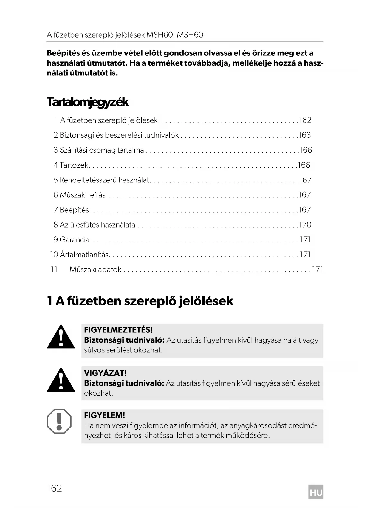 FIGYELMEZTETÉS! Biztonsági tudnivaló: Az utasítás figyelmen kívül hagyása halált vagy súlyos sérülést okozhat. VIGYÁZAT! Biztonsági tudnivaló: Az utasítás figyelmen kívül hagyása sérüléseket okozhat. FIGYELEM! Ha nem veszi figyelembe az információt, az anyagkárosodást eredmé- nyezhet, és káros kihatással lehet a termék működésére. MSH60-MSH601-IO-16s.book Seite 162 Dienstag, 30. August 2016 6:23 18HU MSH60, MSH601 Biztonsági és beszerelési tudnivalók
