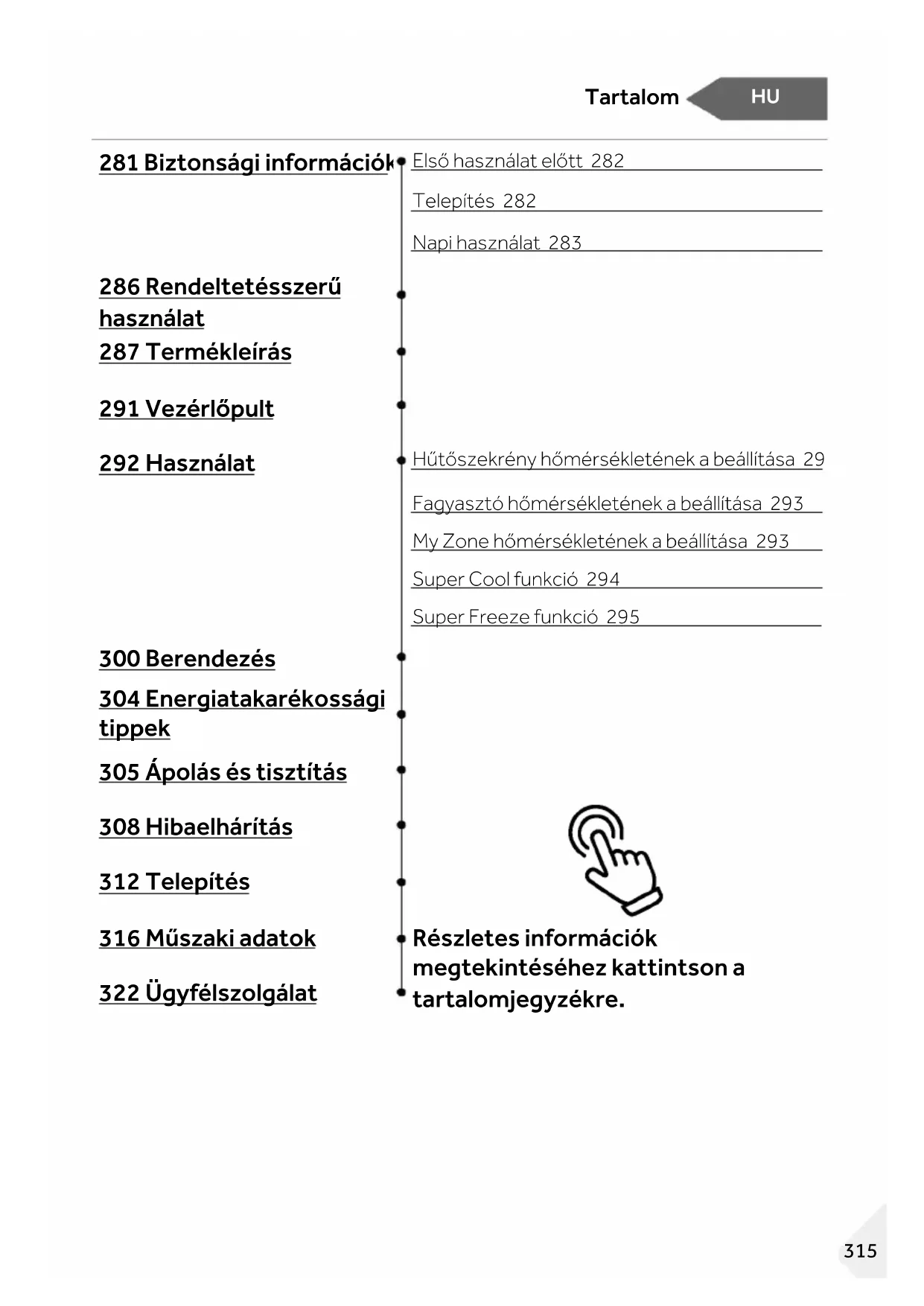 Első használat előtt 282 Telepítés 282 Napi használat 283 286 Rendeltetésszerű használat 287 Termékleírás 291 Vezérlőpult 292 Használat Hűtőszekrény hőmérsékletének a beállítása 293 Fagyasztó hőmérsékletének a beállítása 293 My Zone hőmérsékletének a beállítása 293 Super Cool funkció 294 Super Freeze funkció 295 300 Berendezés 304 Energiatakarékossági tippek 305 Ápolás és tisztítás 308 Hibaelhárítás 312 Telepítés 316 Műszaki adatok Részletes információk megtekintéséhez kattintson a tartalomjegyzékre. 322 Ügyfélszolgálat 315HU Köszönjük Köszönjük, hogy Haier terméket vásárolt. A készülék használata előtt olvassa el figyelmesen ezeket az utasításokat. Az utasítások fontos információkat tartalmaznak, amelyek segítenek abban, hogy a lehető legtöbbet hozza ki a készülékből, és szavatolják a biztonságos és megfelelő telepítést, használatot és karbantartást. Tartsa ezt a kézikönyvet könnyen elérhető helyen, hogy bármikor fellapozhassa a készülék biztonságos és megfelelő használatához. Ha eladja a készüléket, elajándékozza, vagy a lakásban hagyja költözéskor, győződjön meg arról, hogy ezt a kézikönyvet is átadja, hogy az új tulajdonos megismerhesse a készüléket és a biztonsági figyelmeztetéseket. Tartozékok Ellenőrizze a tartozékokat és a szakirodalmat ennek a listának megfelelően: Tojástálca Energiacímke Jótállási jegy Felhasználói kézikönyv Jégkocka tartó tálca Ajtózsanérok Csuklópánt Kupakbetét 316HU Biztonsági információk Biztonsági inf ormáci ók FIGYELMEZTETÉS - Fontos biztonsági információk MEGJEGYZÉS - Általános információk és tippek Környezetvédelmi információk Ártalmatlanítás Járuljon hozzá a környezet és az emberi egészség védelméhez. Az újrahasznosítás érdekében a csomagolást a megfelelő hulladéktárolóba selejtezze ki. Járuljon hozzá az elektromos és elektronikus berendezések hulladékainak az újrahasznosításához. Ne a háztartási hulladékkal együtt dobja ki az ezzel a szimbólummal jelölt készülékeket. Vigye vissza a terméket a helyi újrahasznosító létesítménybe, vagy vegye fel a kapcsolatot a helyi hivatallal. FIGYELMEZTETÉS! Sérülés vagy fulladás veszélye! A hűtőközegeket és a gázokat szakszerűen kell ártalmatlanítani. Győződjön meg a hűtőkör csövének a sértetlenségéről, mielőtt megfelelően ártalmatlanítaná. Válassza le a készüléket a hálózati tápellátásról. Vágja el a hálózati kábelt és selejtezze ki. Távolítsa el a tálcákat és fiókokat, valamint az ajtóreteszt és a tömítéseket, hogy megakadályozza a gyermekek és háziállatok bezáródását a készülékbe. 317HU Biztonsági információk A készülék első bekapcsolása előtt olvassa el a következő biztonsági tanácsokat: FIGYELMEZTETÉS! Első használat előtt ► Győződjön meg arról, hogy szállítás során a termék nem sérült.► Távolítsa el az összes csomagolóanyagot, és tartsa gyermekektől elzárva.► A készülék telepítése előtt várjon legalább két órát a hűtőkör teljes hatékonyságának biztosítása érdekében. ► Mivel a készülék nehéz, mindig legalább két személy szükséges a kezeléséhez vagy mozgatásához. Telepítés ► A készüléket jól szellőző helyre telepítse. Biztosítson legalább 10 cm-es helyet a készülék felett és körül. ► Soha ne helyezze a készüléket nedves területre vagy olyan helyre, ahol víz fröccsenhet rá. A vízfröccsenéseket és a foltokat törölje le és szárazra puha, tiszta törlőkendővel. ► Ne szerelje be a készüléket közvetlen napsugárzásnak kitett helyre vagy hőforrások (pl. kályhák, fűtőberendezések) közelébe. ► A méretének és felhasználásnak megfelelő helyre szerelje be és állítsa szintbe a készüléket. ► A berendezésen vagy a beépített szerkezetben a szellőzőnyílásokat ne takarja el. ► Bizonyosodjon meg arról, hogy az adattáblán olvasható elektromos jellemzők megfelelnek az elérhető tápellátás jellemzőinek. Ellenkező esetben forduljon villanyszerelőhöz. ► A készülék 220–240 V váltóáramú, 50 Hz-es tápellátást igényel. A rendellenes feszültségingadozás nyomán előfordulhat, hogy a készülék nem indul be, károsodhat a hőmérséklet-vezérlő vagy a kompresszor, illetve működés során rendellenes zaj jelentkezhet. Hasonló esetben szereljen fel automatikus feszültségszabályozót. ► Ne használjon többdugós adaptereket és hosszabbítókábeleket.► Ne helyezzen több hordozható csatlakozót vagy hordozható tápegységet a berendezés mögé. ► Ügyeljen arra, hogy a tápkábel ne szoruljon a hűtőszekrény alá. Ne lépjen a tápkábelre. 318HU Biztonsági információk FIGYELMEZTETÉS! ► A tápegységhez külön földelt aljzatot használjon, amely könnyen hozzáférhető. A készülék mindenképpen földelésre szorul. Csak az Egyesült Királyság esetén: A készülék tápkábele 3 érintkezős (földeléses) dugasszal rendelkezik, amelyik szabványos 3 érintkezős (földeléses) aljzathoz illeszkedik. Soha ne vágja le vagy távolítsa el a harmadik érintkezőt (földelést). A készülék beszerelését követően a dugasznak hozzáférhetőnek kell maradnia. ► Ne okozza a hűtőközeg kör sérülését. Napi használat ► A berendezést 8 évnél idősebb gyermekek vagy csökkent fizikai, érzékszervi vagy mentális képességű, vagy tapasztalattal és ismerettel nem rendelkező személyek akkor használhatják, ha felügyelet alatt állnak vagy ha megfelelő utasításokkal látták el őket a berendezés biztonságos használatát illetően, és megértették a használatból eredő veszélyeket. ► A 3 és 8 év közötti gyermekek be- és kirakodhatják a hűtőkészülékeket, de a hűtőkészülékek tisztítását és s