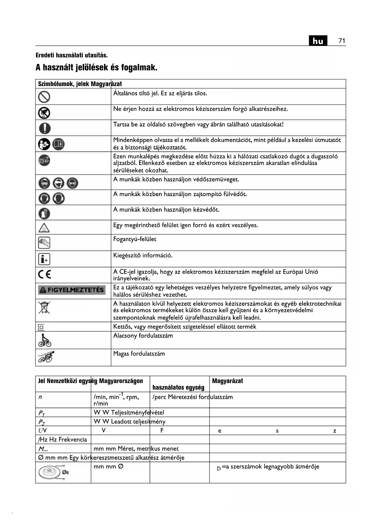 Az elektromos keziszerszámra tablák et jeleket csavarokkal vagy szegecsekkel felerősiteni tilos. Egy megrongálodott szigetelés mar nem nyújt védelmet az áramütés ellen. Hasznaljon ontapados matricákat.