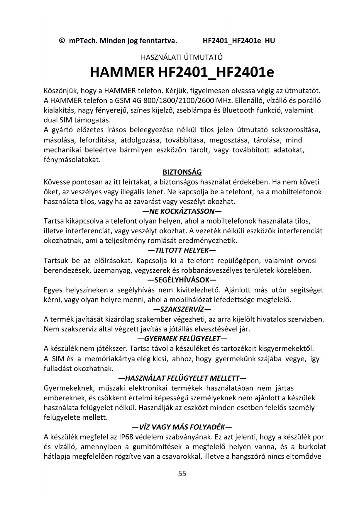 HAMMER HF2401_HF2401e Köszönjük, hogy a HAMMER telefon. Kérjük, figyelmesen olvassa végig az útmutatót. A HAMMER telefon a GSM 4G 800/1800/2100/2600 MHz. Ellenálló, vízálló és porálló kialakítás, nagy fényerejű, színes kijelző, zseblámpa és Bluetooth funkció, valamint dual SIM támogatás. A gyártó előzetes írásos beleegyezése nélkül tilos jelen útmutató sokszorosítása, másolása, lefordítása, átdolgozása, továbbítása, megosztása, tárolása, mind mechanikai beleértve bármilyen eszközön tárolt, vagy továbbított adatokat, fénymásolatokat. BIZTONSÁG Kövesse pontosan az itt leírtakat, a biztonságos használat érdekében. Ha nem követi őket, az veszélyes vagy illegális lehet. Ne kapcsolja be a telefont, ha a mobiltelefonok használata tilos, vagy ha az zavarást vagy veszélyt okozhat.
