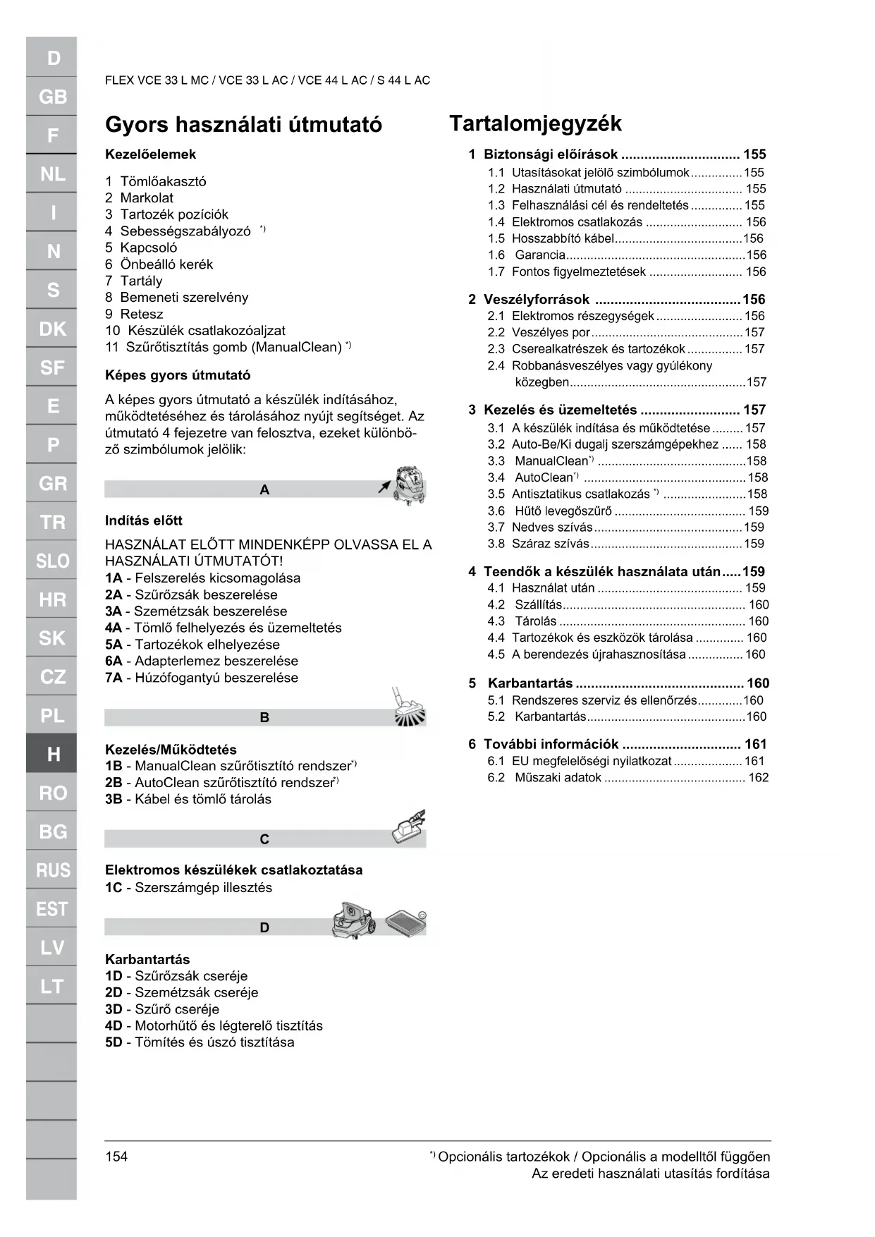 FLEX VCE 33 L MC / VCE 33 L AC / VCE 44 L AC / S 44 L AC 1 Biztonsági előírások Ez a dokumentum a készülékre vonatkozó biz- tonsági tudnivalókat, illetve egy gyors használati útmutatót tartalmaz. Mielőtt először bekapcsolja a készüléket, olvassa el figyelmesen ezt a használati útmutatót. Tegye az útmutatót olyan helyre, ahol később is megtalálja. További támogatás A készülékről további információ talál a honlapun- kon: www.flex-tools.com. További kérdések esetén keresse a Flex országo- san felelős szervizképviselőjét. Lásd a dokumentum hátsó oldalán.