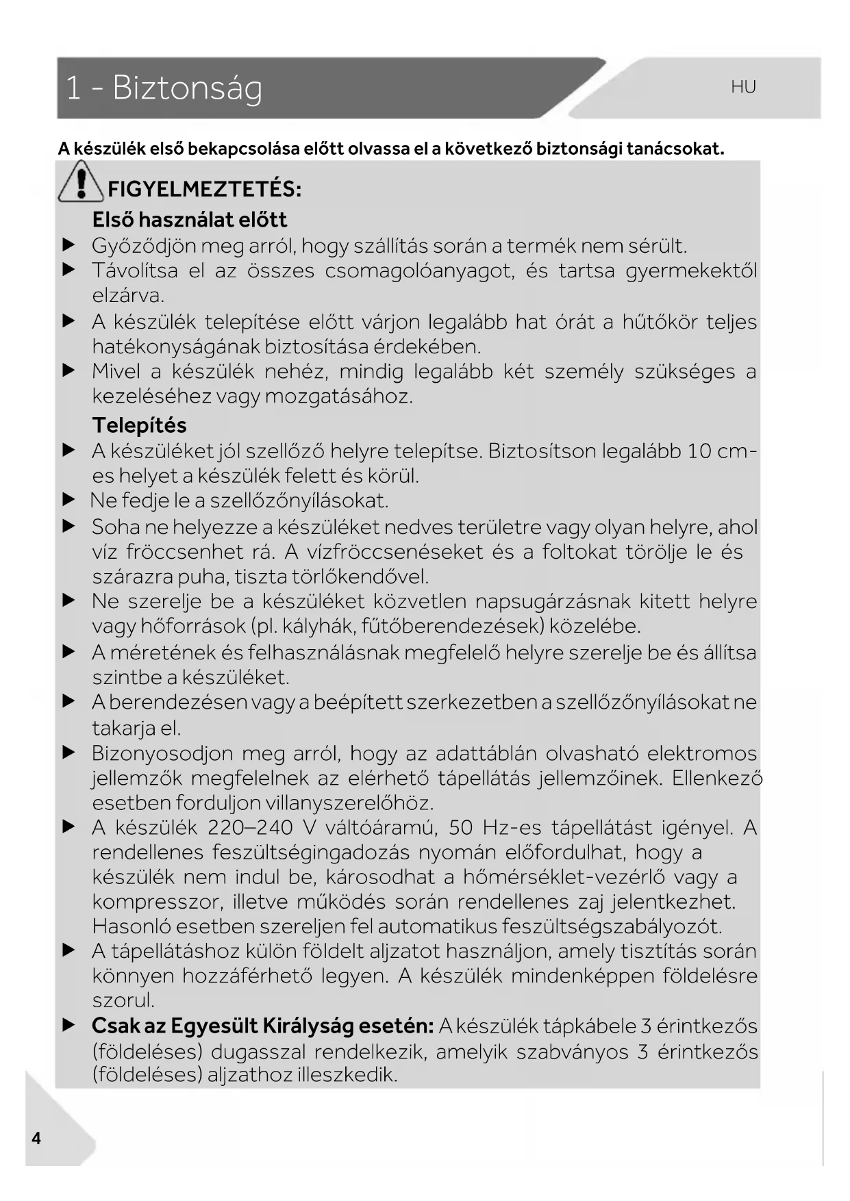 A készülék elsQ bekapcsolása elQtt olvassa el a következQ biztonsági tanácsokat. FIGYELMEZTETÉS: ElsQ használat elQtt GyQzQdjön meg arról, hogy szállítás során a termék nem sérült. Távolítsa el az összes csomagolóanyagot, és tartsa gyermekektQl elzárva. A készülék telepítése elQtt várjon legalább hat órát a hqtQkör teljes hatékonyságának biztosítása érdekében. Mivel a készülék nehéz, mindig legalább két személy szükséges a kezeléséhez vagy mozgatásához. Telepítés A készüléket jól szellQzQ helyre telepítse. Biztosítson legalább 10 cm- es helyet a készülék felett és körül. Ne fedje le a szellQzQnyílásokat. Soha ne helyezze a készüléket nedves területre vagy olyan helyre, ahol víz fröccsenhet rá. A vízfröccsenéseket és a foltokat törölje le és szárazra puha, tiszta törlQkendQvel. Ne szerelje be a készüléket közvetlen napsugárzásnak kitett helyre vagy hQforrások (pl. kályhák, fqtQberendezések) közelébe. A méretének és felhasználásnak megfelelQ helyre szerelje be és állítsa szintbe a készüléket. A berendezésen vagy a beépített szerkezetben a szellQzQnyílásokat ne takarja el. Bizonyosodjon meg arról, hogy az adattáblán olvasható elektromos jellemzQk megfelelnek az elérhetQ tápellátás jellemzQinek. EllenkezQ esetben forduljon villanyszerelQhöz. A készülék 220–240 V váltóáramú, 50 Hz-es tápellátást igényel. A rendellenes feszültségingadozás nyomán elQfordulhat, hogy a készülék nem indul be, károsodhat a hQmérséklet-vezérlQ vagy a kompresszor, illetve mqködés során rendellenes zaj jelentkezhet. Hasonló esetben szereljen fel automatikus feszültségszabályozót. A tápellátáshoz külön földelt aljzatot használjon, amely tisztítás során könnyen hozzáférhetQ legyen. A készülék mindenképpen földelésre szorul. Csak az Egyesült Királyság esetén: A készülék tápkábele 3 érintkezQs (földeléses) dugasszal rendelkezik, amelyik szabványos 3 érintkezQs (földeléses) aljzathoz illeszkedik.1 - Biztonság