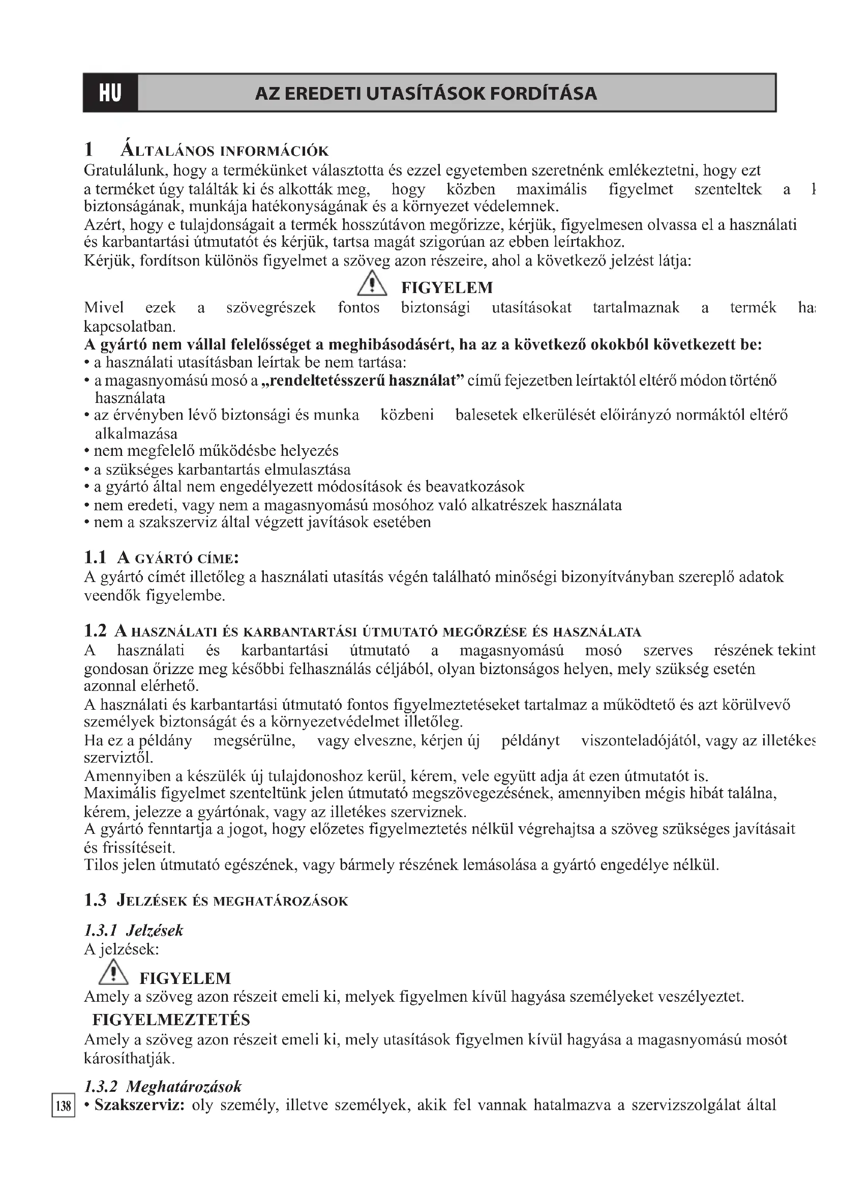 A hasznalati es karbantartasi utmutato a magasnyomásu mosó szerves részenek tekint gondosan orizze meg késobbi felhasznalás céljából, olyanBiztonságos helyen, mely szükség eseten azonnal elerheto.