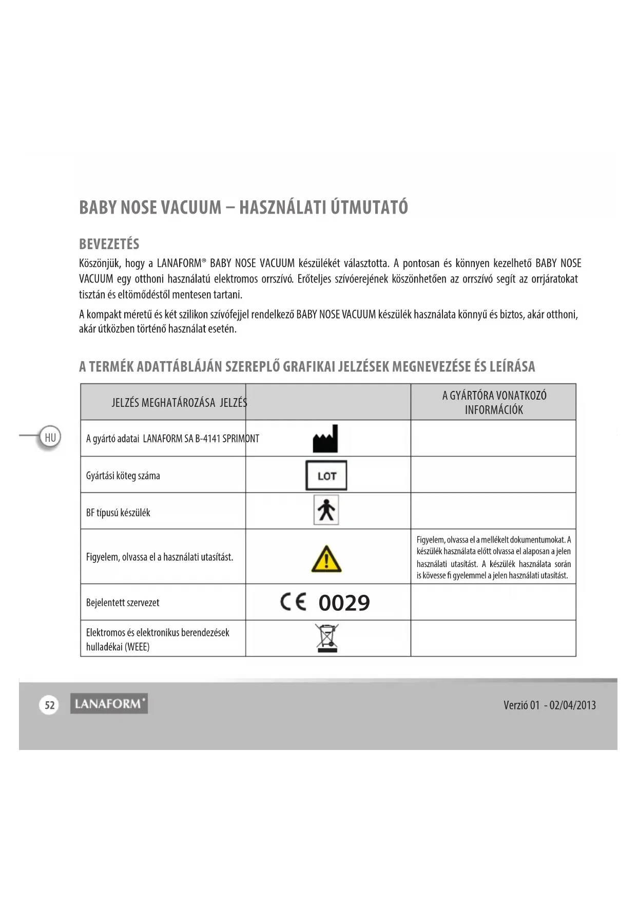 BEVEZETÉS Köszönjük, hogy a LANAFORM® BABY NOSE VACUUM készülékét választotta. A pontosan és könnyen kezelhető BABY NOSE VACUUM egy otthoni használatú elektromos orrszívó. Erőteljes szívóerejének köszönhetően az orrszívó segít az orrjáratokat tisztán és eltömődéstől mentesen tartani. A kompakt méretű és két szilikon szívófejjel rendelkező BABY NOSE VACUUM készülék használata könnyű és biztos, akár otthoni, akár útközben történő használat esetén. A TERMÉK ADATTÁBLÁJÁN SZEREPLŐ GRAFIKAI JELZÉSEK MEGNEVEZÉSE ÉS LEÍRÁSA JELZÉS MEGHATÁROZÁSA JELZÉS