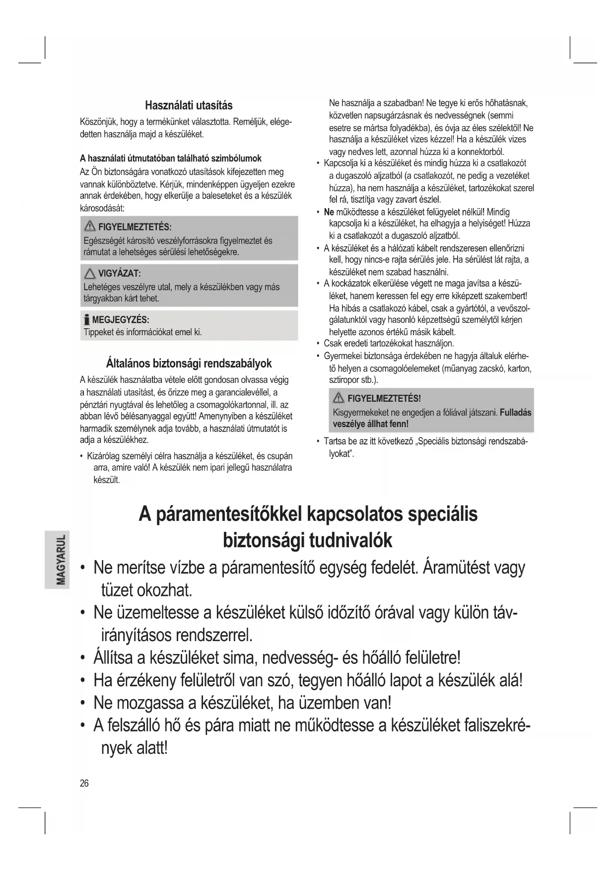 - Tartsa be az itt következő „Speciális biztonsági rendszabá- lyokat”. A páramentesítőkkel kapcsolatos speciális biztonsági tudnivalók