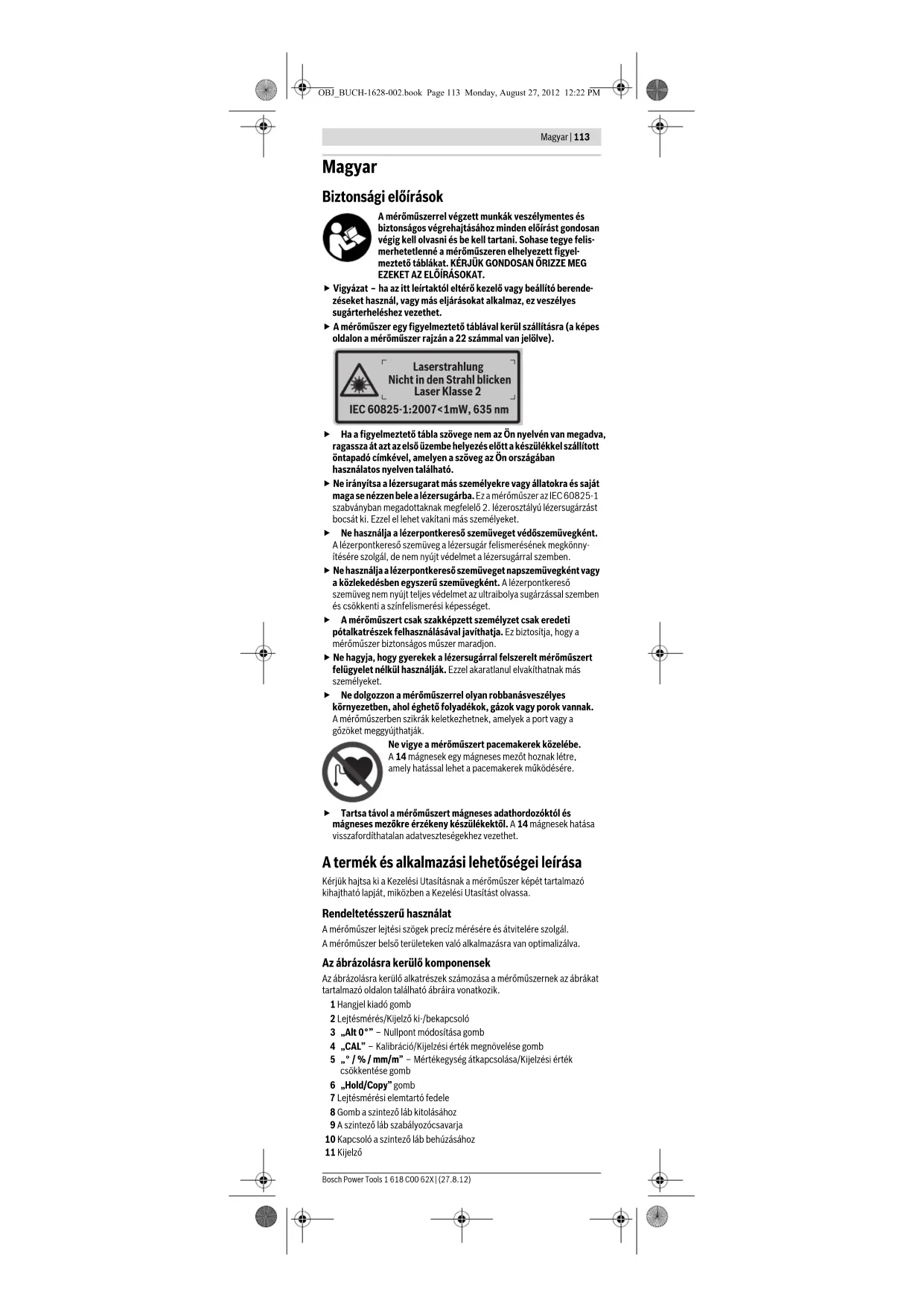 Potom musíte merací prístroj kalibrovať pre protiľahlú prikladaciu plochu. Otočte na tento účel merací prístroj okolo horizontálnej osi tak, aby bola libela 12 otočená smerom dole a displej 11 smerom k Vám. Položte merací prístroj na vodorovnú plochu. Počkajte 10 sek. Stlačte potom na cca 2 sek. tlačidlo kalibrácie „CAL“ 4, až sa na displeji zobrazí na chvíľu „CAL1“. Nameraná hodnota potom bliká na displeji. Otočte merací prístroj o 180˚ okolo zvislej osi tak, aby libela naďalej ukazovala smerom hore, ale aby sa displej 11 nachádzal na strane odvrátenej od Vás. Počkajte 10 sek. Potom stlačte kalibračné tlačidlo „CAL“ 4 znova. Na displeji sa nakrátko zobrazí „CAL2“. Potom sa objaví na displeji nameraná hodnota (teraz už nebliká). Merací prístroj je teraz znova kalibrovaný pre obe vodorovné dosadacie plochy. Upozornenie: Keď sa merací prístroj pri krokoch a neotočí okolo osi zobrazenej na obrázku, nemôže sa kalibrácia ukončiť (indikácia „CAL2“ sa na displeji nezobrazí). OBJ_BUCH-1628-002.book Page 111 Monday, August 27, 2012 12:22 PM112 | Slovensky 1 618 C00 62X | (27.8.12) Bosch Power Tools Kalibrovanie zvislých prikladacích plôch (pozri obrázok F) Plocha, na ktorú prikladáte merací prístroj, sa nesmie odlišovať o viac ako 5° od zvislej plochy. Ak by bola odchýlka väčšia, kalibrácia sa s indikáciou „---“ preruší. Zapnite merací prístroj a priložte ho na zvislú plochu tak, aby libela 13 smerovala hore a displej 11 bol obrátený smerom k Vám . Počkajte 10 sek. Stlačte potom na cca 2 sek. tlačidlo kalibrácie „CAL“ 4, až sa na displeji zobrazí na chvíľu „CAL1“. Nameraná hodnota potom bliká na displeji. Otočte merací prístroj o 180° okolo zvislej osi 11 tak, aby libela naďalej ukazovala smerom hore, ale aby sa displej nachádzal na strane odvrátenej od Vás. Počkajte 10 sek. Potom stlačte kalibračné tlačidlo „CAL“ 4 znova. Na displeji sa nakrátko zobrazí „CAL2“. sa objaví na displeji nameraná hodnota (teraz už nebliká). Merací prístroj je teraz znova kalibrovaný pre túto dosadaciu – prikladaciu plochu. Potom musíte merací prístroj kalibrovať pre protiľahlú prikladaciu plochu. Otočte na tento účel merací prístroj okolo horizontálnej osi tak, aby bola libela 13 otočená smerom dole a displej 11 smeroval k Vám. Priložte merací prístroj na zvislú plochu. Počkajte 10 sek. Stlačte potom na cca 2 sek. tlačidlo kalibrácie „CAL“ 4, až sa na displeji zobrazí na chvíľu „CAL1“. Nameraná hodnota potom bliká na displeji. Otočte merací prístroj o 180˚ okolo zvislej osi tak, aby libela naďalej ukazovala smerom hore, ale aby sa displej 11 nachádzal na strane odvrátenej od Vás. Počkajte 10 sek. Potom stlačte tlačidlo kalibrácie „CAL“ 4 znova. Na displeji sa nakrátko zobrazí „ CAL2“. Potom sa objaví na displeji nameraná hodnota (teraz už nebliká). Merací prístroj je teraz znova kalibrovaný pre obe zvislé prikladacie plochy. Upozornenie: Keď sa merací prístroj pri krokoch a neotočí okolo osi zobrazenej na obrázku, nemôže sa kalibrácia ukončiť (indikácia „CAL2“ sa na displeji nezobrazí). Údržba a servis Údržba a čistenie Merací prístroj skladujte a transportujte v ochrannej taške, ktorá sa dodáva spolu s meracím prístrojom. Udržiavajte svoj merací prístroj vždy v čistote. Neponárajte merací prístroj do vody ani do iných kvapalín. Znečistenia utrite vlhkou mäkkou handričkou. Nepoužívajte žiadne čistiace prostriedky ani rozpúšťadlá. Čistite pravidelne predovšetkým plochy na výstupnom otvore a dávajte pozor, aby ste pritom odstránili prípadné zachytené vlákna tkaniny. Ak by merací prístroj napriek starostlivej výrobe a kontrole predsa len prestal niekedy fungovať, treba dať opravu vykonať autorizovanej servisnej opravovni ručného elektrického náradia Bosch. Merací prístroj sami nikdy neotvárajte. Pri všetkých dopytoch a objednávkach náhradných súčiastok uvádzajte bezpodmienečne 10-miestne vecné číslo uvedené na typovom štítku výrobku. V prípade potreby zasielajte merací prístroj do opravy v ochrannej taške 24. Servisné stredisko a poradenská služba pre zákazníkov Servisné stredisko Vám odpovie na otázky týkajúce sa opravy a údržby Vášho produktu ako aj náhradných súčiastok. Rozložené obrázky a informácie k náhradným súčiastkam nájdete aj na web-stránke: www.bosch-pt.com Tím poradenskej služby pre zákazníkov Bosch Vám rád pomôže aj pri problémoch týkajúcich sa kúpy a nastavenia produktov a príslušenstva. Slovakia Tel.: +421 (02) 48 703 800 Fax: +421 (02) 48 703 801 E-Mail: servis.naradia@sk.bosch.com www.bosch.sk Likvidácia Výrobok, príslušenstvo a obal treba dať na recykláciu šetriacu životné prostredie. Neodhadzujte opotrebované meracie prístroje ani akumulátory/batérie do komunálneho odpadu! Len pre krajiny EÚ: Podľa Európskej smernice 2002/96/ES sa musia už nepoužiteľné meracie prístroje a podľa európskej smernice 2006/66/ES sa musia poškodené alebo opotrebované akumulátory/batérie zbierať separovane a treba ich dávať na recykláciu zodpovedajúcu ochrane životného prostredia. Zmeny vyhradené. OBJ_BUCH-1628-002.book Page 112 Monday, August 27, 2012 12:22 PMMagyar | 113 Bosch Power Tools 1 618 C00 62X | (27.8.12) Magyar Biztonsági előírások A mérőműszerrel végzett munkák veszélymentes és biztonságos végrehajtásához minden előírást gondosan végig kell olvasni és be kell tartani. Sohase tegye felis- merhetetlenné a mérőműszeren elhelyezett figyel- meztető táblákat. KÉRJÜK GONDOSAN ŐRIZZE MEG EZEKET AZ ELŐÍRÁSOKAT. f Vigyázat – ha az itt leírtaktól eltérő kezelő vagy beállító berende- zéseket használ, vagy más eljárásokat alkalmaz, ez veszélyes sugárterheléshez vezethet. f A 