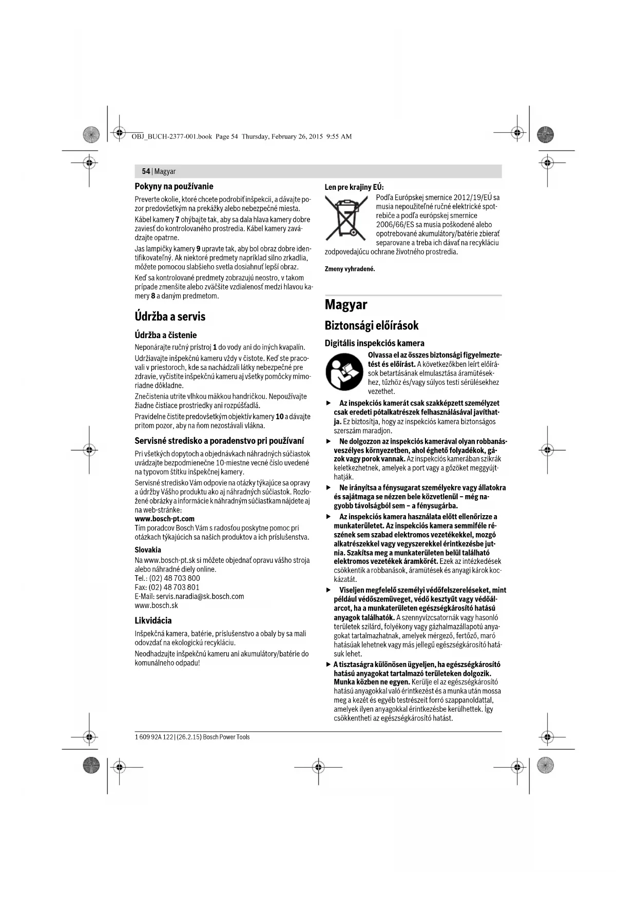 OBJ_BUCH-2377-001.book Page 52 Thursday, February 26, 2015 9:55 AMSlovensky | 53 Bosch Power Tools 1 609 92A 122 | (26.2.15) Montáž Vkladanie/výmena batérií Na prevádzku inšpekčnej kamery sa odporúča používať alka- lické mangánové batérie. Na otvorenie krytu priehradky na batérie 12 zatlačte na aretá- ciu 13 a kryt priehradky na batérie 12 odklopte. Vytiahnite priehradku na batérie 11 a vložte batérie. Dbajte pritom na správnu polaritu, podľa znázornenia na vnútornej strane priehradky na batérie 11. Zasuňte priehradku na batérie 11 až na doraz a zatvorte kryt priehradky na batérie 12. Pri nízkej úrovni nabitia batérií sa najprv na displeji zobrazí symbol . Ak je symbol batérie prázdny, musíte batérie vy- meniť, vykonávanie inšpekcií už nie je možné. Vymieňajte vždy všetky batérie súčasne. Pri jednej výmene používajte len batérie jedného výrobcu a vždy také, ktoré ma- jú rovnakú kapacitu. Vyberte batérie z inšpekčnej kamery v prípade, že ju nebudete dlhší čas používať. Batérie môžu pri dlhšom skladovaní korodovať a dochádza k ich samočinnému vybí- janiu. Montáž kábla kamery (pozri obrázok A) Pri používaní inšpekčnej kamery musí byť kábel kamery 7 pri- montovaný k ručnému prístroju 1. Nasuňte konektor kábla kamery 7 v správnej pozícii na prípoj- ku kamery 14, až pokiaľ nezaskočí. Demontáž kábla kamery (pozri obrázok B) Na odobratie kábla kamery 7 stlačte aretáciu 15 dohromady a vytiahnite konektor z ručného prístroja 1. Montáž zrkadla, magnetu a háčika (pozri obrázok C) Zrkadlo 18, magnet 16 a háčik 17 môžete namontovať na hla- vu kamery 8 ako pomôcky. Nasuňte jednu z týchto troch pomôcok podľa polohy na ob- rázku až na doraz na výrez na hlave kamery 8. Upozornenie: Magnet 16 a háčik 17 sú vhodné iba na pohy- bovanie a odstraňovanie voľne položených, drobných a ľah- kých predmetov. V prípade príliš silného ťahania sa môže in- špekčná kamera alebo príslušná pomôcka poškodiť. Používanie Ručný prístroj 1 a batérie chráňte pred vlhkosťou a priamym slnečným žiarením. Kábel kamery a hlava ka- mery sú pri správnej montáži vodotesné. Ručný prístroj a batérie nie sú však chránené proti vode, pri kontakte s vodou existuje riziko úrazu elektrickým prúdom alebo ri- ziko poškodenia. Nevystavujte inšpekčnú kameru extrémnym teplotám ani príliš veľkému kolísaniu teploty. Nenechávajte ju napríklad odloženú dlhší čas v motorovom vozidle. V prípa- de väčšieho kolísania teploty nechajte najprv inšpekčnú kameru pred použitím temperovať na teplotu prostredia, v ktorom ju budete používať. Nepoužívajte inšpekčnú kameru vtedy, keď je objektív v hlave kamery 8 orosený. Inšpekčnú kameru zapínajte až vtedy, keď sa spomínaná vlhkosť odparila. V takomto prípade by sa mohla inšpekčná kamera poškodiť. Zapnuté svetlo 9 môže byť počas prevádzky horúce. Nedotýkajte sa svetla, čím zabránite vzniku popálenín. Uvedenie do prevádzky Zapínanie/vypínanie Na zapnutie inšpekčnej kamery stlačte tlačidlo vypínača 2. Na displeji 5 sa na krátky čas zobrazí úvodná obrazovka. Upozornenie: Ak nie je pri zapnutí namontovaný kábel kame- ry, zobrazuje sa na displeji hlásenie o chybe. Ak chcete inšpekčnú kameru vypnúť, stlačte tlačidlo vypína- ča 2 znova. Ak počas cca 20 minút nestlačíte žiadne tlačidlo na inšpekč- nej kamere, prístroj sa (kvôli šetreniu batérií) automaticky vy- pne. Regulovanie lampičky v hlave kamery Na zvýšenie jasu obrazu kamery môžete zapnúť svetlo 9 v hlave kamery a regulovať jas. Jas je možné nastavovať v 4 stupňoch (0 %, 25 %, 50 %, 100 %). Na zapnutie svetla kamery 9 a na zvýšenie jasu stláčajte tla- čidlo 4 dovtedy, pokiaľ sa nedosiahne želaná úroveň jasu. Nepozerajte sa priamo do lampičky 9 a nesmerujte svetlo lampičky ani na iné osoby. Svetlo lampičky by mohlo poškodiť ľudský zrak. Na zníženie jasu a vypnutie svetla kamery 9 stláčajte tlačidlo 4 dovtedy, pokiaľ sa nedosiahne želaná úroveň jasu alebo po- kiaľ sa svetlo nevypne. Zväčšenie obrazu na displeji (priblíženie/zoom) Krátkym stlačením tlačidla 6 môžete obraz na displeji zväčšiť 1,5- alebo 2-násobne. Tlačidlo pre čierno-biele zobrazovanie Krátkym stlačením tlačidla 3 môžete prepínať farebné a čierno-biele zobrazovanie na displeji. Čierno-bielym zobra- zením sa môže zlepšiť napríklad kontrast. Zobrazenie Compass View s referenčným bodom (Up-In- dicator) (pozri obrázok D) Dlhým stlačením tlačidla 3 prejdete do režimu zobrazenia Compass View e. Žltý referenčný bod (Up-Indicator) pritom udáva, kde sa v obraze fyzicky nachádza strana označovaná ako „hore“. Upozornenie: Funkcia je obmedzená pri namontovanom zrkadle 18 a/alebo pri vertikálnom vyrovnaní kábla kamery 7. Stavový riadok Stavový riadok a sa po každom stlačení tlačidla zapne na disp- leji na cca 2 sekundy. Udáva: –nastavené zväčšenie (b) –nastavený jas (c) – stav nabitia batérií (d). OBJ_BUCH-2377-001.book Page 53 Thursday, February 26, 2015 9:55 AM54 | Magyar 1 609 92A 122 | (26.2.15) Bosch Power Tools Pokyny na používanie Preverte okolie, ktoré chcete podrobiť inšpekcii, a dávajte po- zor predovšetkým na prekážky alebo nebezpečné miesta. Kábel kamery 7 ohýbajte tak, aby sa dala hlava kamery dobre zaviesť do kontrolovaného prostredia. Kábel kamery zavá- dzajte opatrne. Jas lampičky kamery 9 upravte tak, aby bol obraz dobre iden- tifikovateľný. Ak niektoré predmety napríklad silno zrkadlia, môžete pomocou slabšieho svetla dosiahnuť lepší obraz. Keď sa kontrolované predmety zobrazujú neostro, v takom prípade zmenšite alebo zväčšite vzdialenosť medzi hlavou ka- mery 8 a daným predmetom. Údržba a servis Údržba a čistenie Neponárajte ručný prís