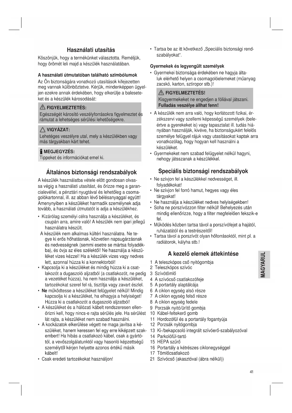 - Tartsa távol a porszívót olyan hőforrásoktól, mint pl. a radiátorok, kályha stb.! A kezelő elemek áttekintése 1 A teleszkópos cső nyitógombja 2 Teleszkópos szívóc 3 Szívótömlő 4 A szívócső csatlakozófeje 5 A portartály alaptálcája 6 A ciklon egység alsó része 7 A ciklon egység felső része 8 A ciklon egység fedele 9 Porzsák nyitó/ürítő gombja 10 Kábel-feltekerő gomb 11 Hordozófül és a portartály fogantyúja 12 Porzsák nyitógombja 13 Ki-/bekapcsoló integrált szívóerő-szabályozóval 14 Parkolófül-tartó 15 HEPA szűrő 16 Portartály a kétrészes ciklonegységgel 17 Tömlőcsatlakozó 21 Szívócső (akasztóval (ábra nélkül)) Használati utasítás Köszönjük, hogy a termékünket választotta. Reméljük, hogy örömét leli majd a készülék használatában. A használati útmutatóban található szimbólumok Az Ön biztonságára vonatkozó utasítások kifejezetten meg vannak különböztetve. Kérjük, mindenképpen ügyel- jen ezekre annak érdekében, hogy elkerülje a balesete- ket és a készülék károsodását: FIGYELMEZTETÉS: Egészségét károsító veszélyforrásokra gyelmeztet és rámutat a lehetséges sérülési lehetőségekre. VIGYÁZAT: Lehetéges veszélyre utal, mely a készülékben vagy más tárgyakban kárt tehet. MEGJEGYZÉS: Tippeket és információkat emel ki. Általános biztonsági rendszabályok A készülék használatba vétele előtt gondosan olvas- sa végig a használati utasítást, és őrizze meg a garan- cialevéllel, a pénztári nyugtával és lehetőleg a csoma- golókartonnal, ill. az abban lévő bélésanyaggal együtt! Amenynyiben a készüléket harmadik személynek adja tovább, a használati útmutatót is adja a készülékhez.