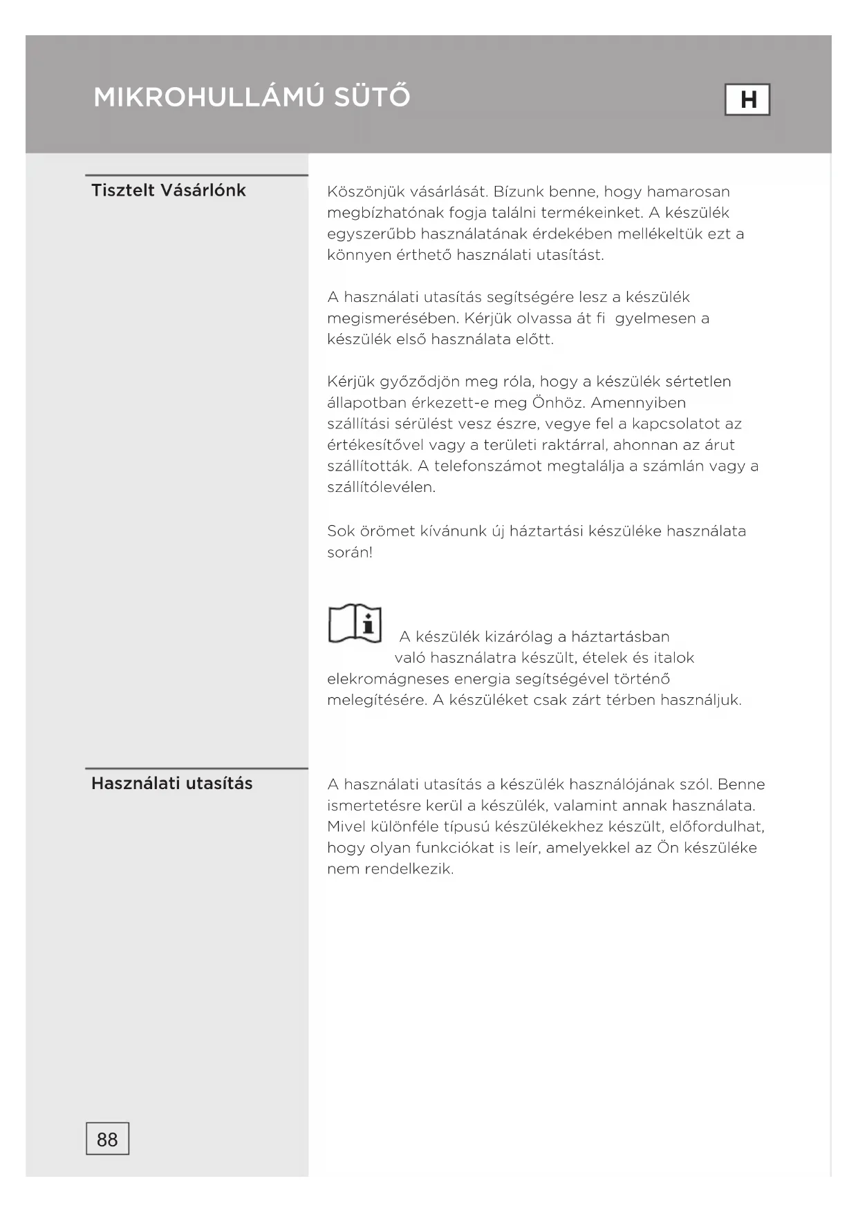 AVANT DE CONTACTER LE SERVICE APRÈSVENTE GARANTIE ET SERVICEKöszönjük vásárlását. Bízunk benne, hogy hamarosan megbízhatónak fogja találni termékeinket. A készülék egyszerűbb használatának érdekében mellékeltük ezt a könnyen érthető használati utasítást. A használati utasítás segítségére lesz a készülék megismerésében. Kérjük olvassa át fi gyelmesen a készülék első használata előtt. Kérjük győződjön meg róla, hogy a készülék sértetlen állapotban érkezett-e meg Önhöz. Amennyiben szállítási sérülést vesz észre, vegye fel a kapcsolatot az értékesítővel vagy a területi raktárral, ahonnan az árut szállították. A telefonszámot megtalálja a számlán vagy a szállítólevélen. Sok örömet kívánunk új háztartási készüléke használata során! A készülék kizárólag a háztartásban való használatra készült, ételek és italok elekromágneses energia segítségével történő melegítésére. A készüléket csak zárt térben használjuk. A használati utasítás a készülék használójának szól. Benne ismertetésre kerül a készülék, valamint annak használata. Mivel különféle típusú készülékekhez készült, előfordulhat, hogy olyan funkciókat is leír, amelyekkel az Ön készüléke nem rendelkezik. Használati utasítás Tisztelt Vásárlónk