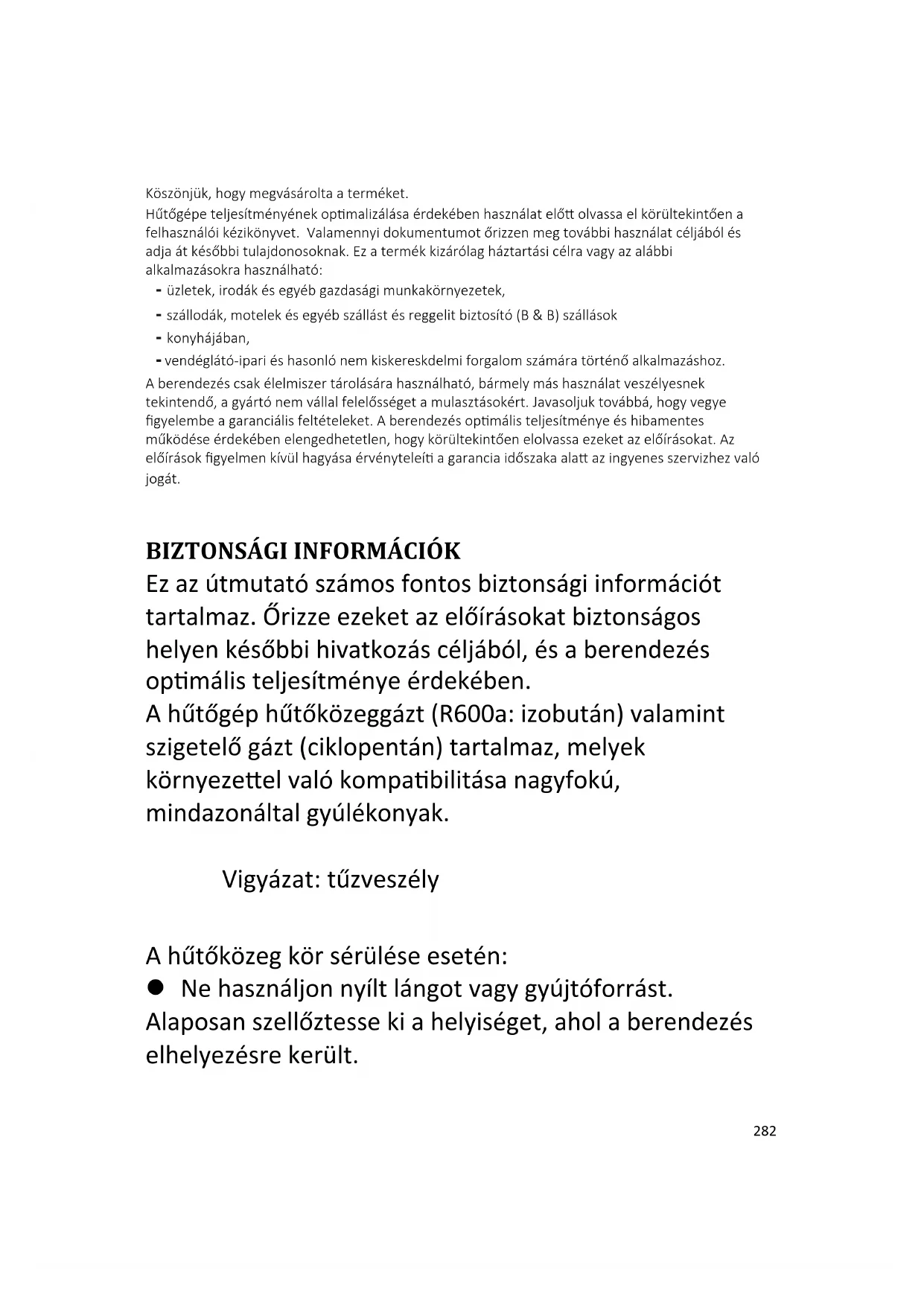 Ez az útmutató számos fontos biztonsági információt tartalmaz. Őrizze ezeket az előírásokat biztonságos helyen későbbi hivatkozás céljából, és a berendezés optimális teljesítménye érdekében. A hűtőgép hűtőközeggázt (R600a: izobután) valamint szigetelő gázt (ciklopentán) tartalmaz, melyek környezettel való kompatibilitása nagyfokú, mindazonáltal gyúlékonyak. Vigyázat: tűzveszély A hűtőközeg kör sérülése esetén: Ne használjon nyílt lángot vagy gyújtóforrást. Alaposan szellőztesse ki a helyiséget, ahol a berendezés elhelyezésre került. Átlagos üzemidő:8℃:Üzemelés11perc,leállás 20perc283
