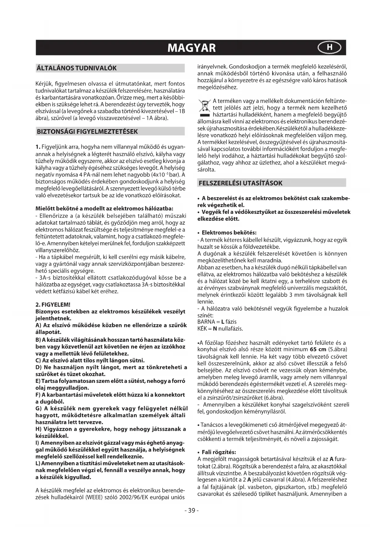 Bizonyos esetekben az elektromos készülékek veszélyt jelenthetnek. A) Az elszívó működése közben ne ellenőrizze a szűrők állapotát. B) A készülék világításának hosszan tartó használata köz- ben vagy közvetlenül azt követően ne érjen az izzókhoz vagy a mellettük lévő felületekhez. C) Az elszívó alatt tilos nyílt lángon sütni. D) Ne használjon nyílt lángot, mert az tönkreteheti a szűrőket és tüzet okozhat. E) Tartsa folyamatosan szem előtt a sütést, nehogy a forró olaj meggyulladjon. F) A karbantartási műveletek előtt húzza ki a konnektort a dugóból. G) A készülék nem gyerekek vagy felügyelet nélkül hagyott, működtetésre alkalmatlan személyek általi használatra lett tervezve. H) Vigyázzon a gyerekekre, hogy nehogy játsszanak a készülékkel.