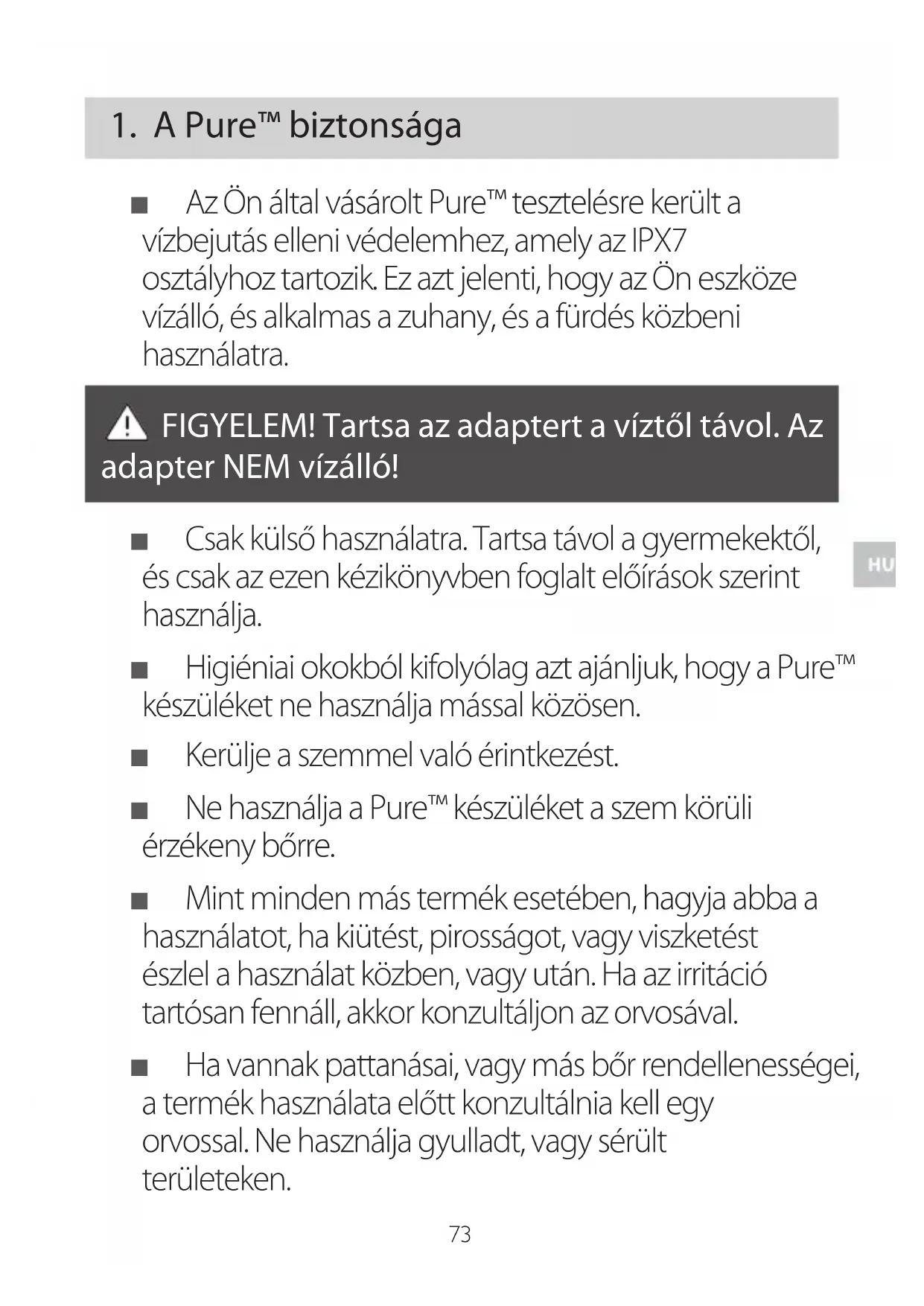 Az Ön által vásárolt Pure™ tesztelésre került a vízbejutás elleni védelemhez, amely az IPX7 osztályhoz tartozik. Ez azt jelenti, hogy az Ön eszköze vízálló, és alkalmas a zuhany, és a fürdés közbeni használatra.
