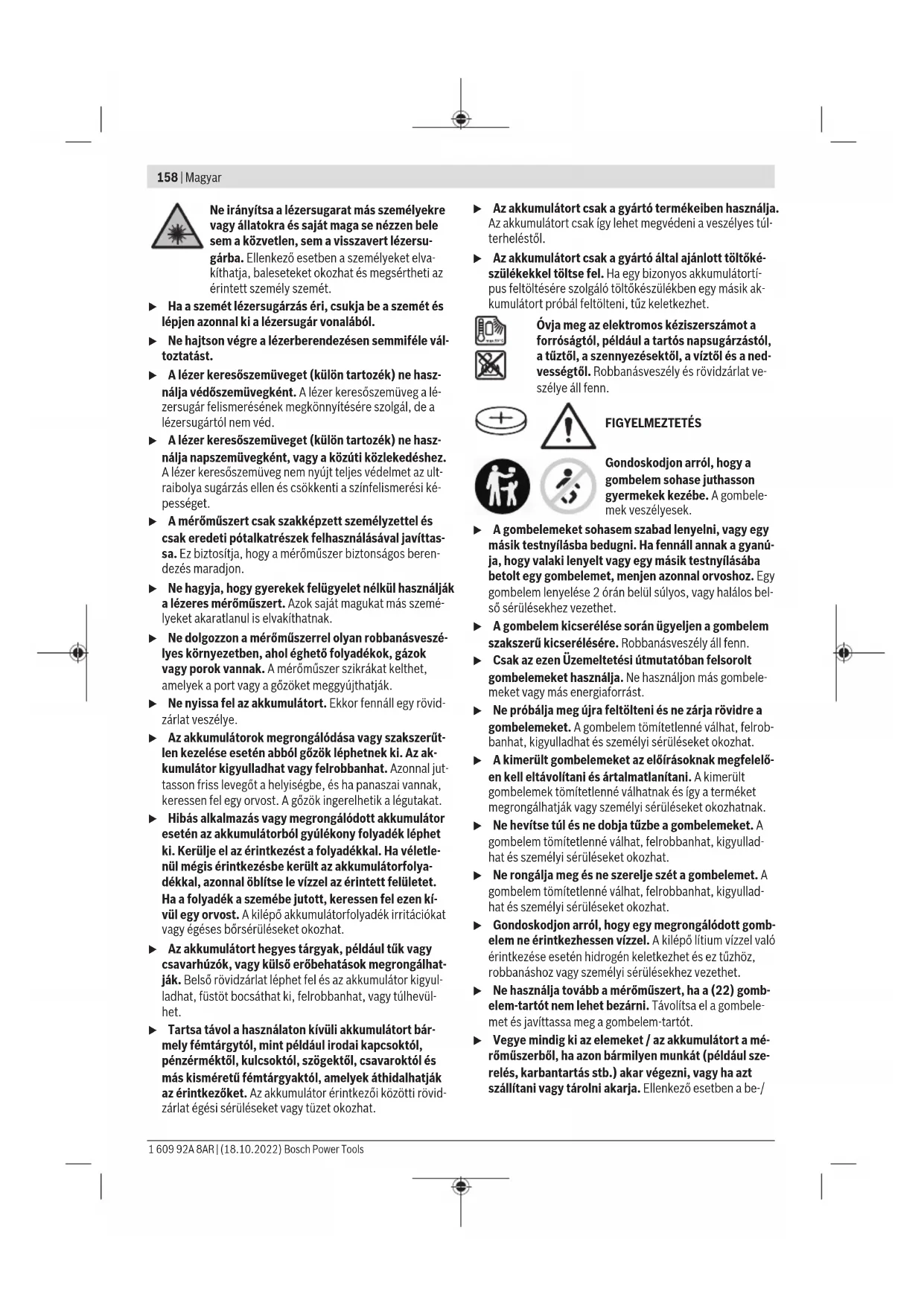 A mérőműszerét a típustáblán található (18) gyári számmal lehet egyértelműen azonosítani. Összeszerelés A mérőműszer energiaellátása A mérőműszer a kereskedelemben kapható elemekkel vagy egy Bosch Li-ion-akkumulátorral üzemeltethető. Üzemelés akkumulátorral u Csak a Műszaki Adatoknál megadott töltőkészüléke- ket használja. Csak ezek a töltőkészülékek vannak ponto- san beállítva az Ön mérőműszerében használható lithium- ionos-akkumulátorok töltésére. Figyelem: A lítium-ion-akkumulátorok a nemzetközi szállítási előírásoknak megfelelően csak részben feltöltve kerülnek ki- szállításra. Az akkumulátor teljes teljesítményének biztosítá- sára az első alkalmazás előtt töltse fel teljesen az akkumulá- tort. Ahhoz, hogy behelyezze a feltöltött (15) akkumulátort, tolja azt be a (10) akkumulátor-kosárba, amíg érezhetően bepat- tan a helyére. A (15) akkumulátor kivételéhez nyomja meg a (13) retesze- lés feloldó gombokat és húzza ki az akkumulátort a (10) ak- kumulátor-kosárból. Ne erőltesse a kihúzást. Üzemeltetés elemekkel A mérőműszer üzemeltetéséhez alkáli-mangán-elemek alkal- mazását javasoljuk. Az elemeket az elemadapterbe kell behelyezni. u Az elemadapter kizárólag az erre előirányzott Bosch gyártmányú mérőműszerekben való használatra szol- gál és elektromos kéziszerszámokkal nem szabad használni. Az elemek behelyezéséhez tolja be az elemadapter (11) tokját a (10) akkumulátor-kosárba. Tegye be az elemeket a (14) zárósapkán található ábrán látható módon a tokba. Tol- ja rá a zárósapkát a tokra, amíg az érezhetően bepattan a he- lyére. A (12) elemek kivételéhez nyomja meg a (14) zárósapka (13) reteszelésfeloldó gombját és húzza le a zárósapkát. Eközben ügyeljen arra, hogy az elemek ne essenek ki. Ehhez a mérő- műszert úgy tartsa, hogy a (10) akkumulátor- kosár felfelé mutasson. Vegye ki az elemeket. A belül fekvő (11) tok eltávolításához nyúljon be- le a tokba és gyakoroljon némi nyomást az ol- dalfalra és így húzza ki a tokot a mérőműszerből. Mindig valamennyi elemet egyszerre cserélje ki. Csak egy azonos gyártó cég azonos kapacitású elemeit használja. u Vegye ki az elemeket a mérőműszerből, ha azt hosz- szabb ideig nem használja. Az elemek a mérőműszeren belüli hosszabb tárolás során korrodálhatnak, vagy magá- tól kimerülhetnek. Bosch Power Tools 1 609 92A 8AR | (18.10.2022)162 | Magyar Feltöltési szintjelző display A(2)feltöltési szint kijelző az akkumulátorok, illetve elemek töltési szintjét mutatja: LED Töltési szint Tartós zöld fény 100–75% Tartós sárga fény 75–35% Tartós piros fény 35–10% Nem világít – Az akkumulátor elromlott – Az elemek kiürültek Ha az akkumulátor, illetve az elemek kimerülnek, a lézervo- nalak fényereje lassan csökken. Ha egy akkumulátor meghibásodott, vagy ha az elemek leme- rültek, azonnal cserélje ki. A gombelem kicserélése (lásd aAábrát) A mérőműszer egy (21)gombelemmel van ellátva, hogy a CAL guard funkcióhoz a dátumot és az időt a készülékbe be- helyezett akkumulátor, illetve elemek nélkül is menteni le- hessen. A gombelem kicseréléséhez vegye ki az akkumulátort, illetve az egész elemadaptert. Húzza ki a(22)gombelem-tartót a(23)gombelem-kosárból. Vegye ki az üres (21)gombelemet és tegyen be egy új gomb- elemet. Ügyeljen a gombelem-tartón található ábrának meg- felelő helyes polaritásra (a pozitív pólusnak felfelé kell mu- tatnia). Tolja bele a(22)gombelem-tartót az abba behelyezett gombelemmel a(23)kosárba. Ügyeljen arra, hogy a gomb- elem-tartót helyes helyzetben és teljes mértékben tolja be, mert ellenkező esetben nincs biztosítva a por és a fröccsenő víz elleni védelem. Az első üzembehelyezés alkalmával távolítsa el a(21)gombelemről a védőfóliát. Ehhez ugyanúgy kell eljár- ni, mint a gombelem kicserélésekor. Üzemeltetés Üzembe helyezés u Óvja meg a mérőműszert a nedvességtől és a közvet- len napsugárzás behatásától. u Ne tegye ki a mérőműszert szélsőséges hőmérsékle- teknek vagy hőmérsékletingadozásoknak. Például ne hagyja a mérőműszert hosszabb ideig az autóban. Na- gyobb hőmérsékletingadozások esetén várja meg, amíg a mérőműszer temperálódik, és a további munkák megkez- dése előtt mindig ellenőrizze a mérőműszer pontosságát (lásd „Amérőműszer pontosságának ellenőrzése”, Ol- dal164). Szélsőséges hőmérsékletek vagy hőmérsékletingadozá- sok esetén a mérőműszer pontossága csökkenhet. u Óvja meg a mérőműszert a heves lökésektől és a le- eséstől. Ha a mérőműszert erős külső hatás érte, a mun- ka folytatása előtt ellenőrizze annak pontosságát (lásd „Amérőműszer pontosságának ellenőrzése”, Oldal164). u A szállításhoz kapcsolja ki a mérőműszert. A kikapcso- láskor az inga egység reteszelésre kerül, mivel az enélkül erős mozgások esetén megrongálódhatna. Be- és kikapcsolás A mérőműszer bekapcsolásához tolja el a (16)be-/kikap- csolót a " On"helyzetbe (az ingamozgás reteszelésével végzett munkákhoz) vagy a " On"helyzetbe (a szintezési automatikával végzett munkákhoz). A mérőműszer a bekap- csolása után azonnal megkezdi a lézervonalak kibocsátását a (1)kilépő nyílásokból. u Ne irányítsa a fénysugarat személyekre vagy állatokra és sajátmaga se nézzen bele közvetlenül – még na- gyobb távolságból sem – a lézersugárba. A mérőműszer kikapcsolásához tolja el a (16)be-/kikap- csolót az Offhelyzetbe. A kikapcsolásnál az inga-egység re- teszelésre kerül. u Ne hagyja a bekapcsolt mérőműszert felügyelet nélkül és a használat befejezése után kapcsolja ki azt. A lézer- sugár más személyeket elvakíthat. A legmagasabb megengedett üzemi hőmér