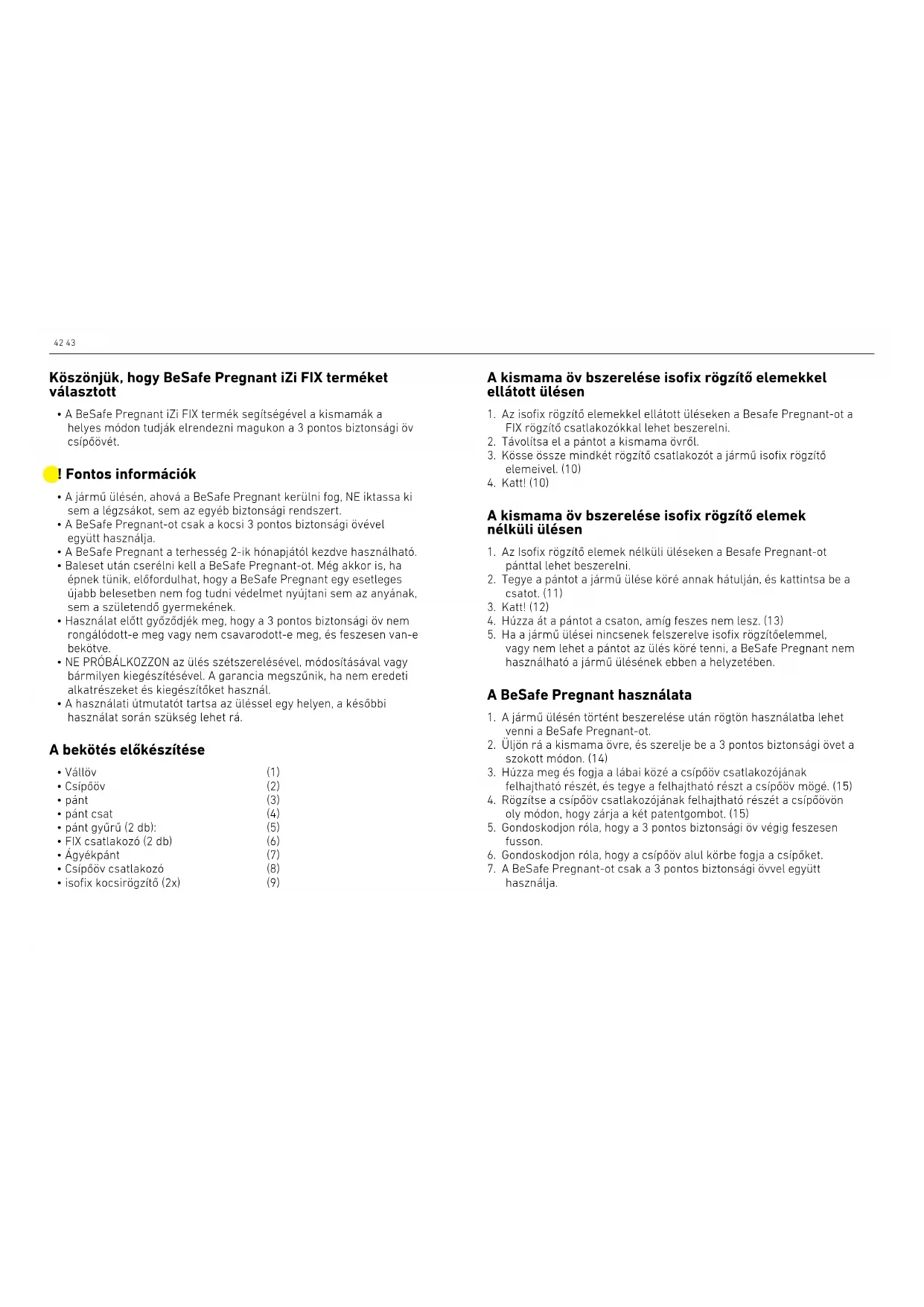 Töltse le az útmutatót a következőhöz Gyerekülés PDF formátumban ingyenesen! Találja meg kézikönyvét Pregnant iZi FIX - BESAFE és vegye vissza elektronikus eszközét a kezébe. Ezen az oldalon közzé van téve az eszköze használatához szükséges összes dokumentum. Pregnant iZi FIX márka BESAFE.