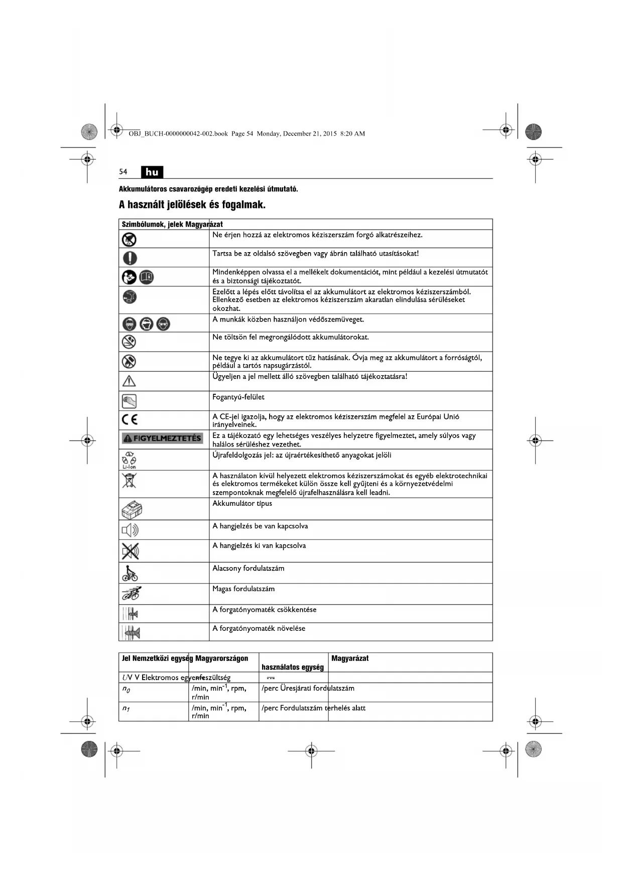 Akkumulátoros csavarozógép eredeti kezelési útmutató. A használt jelölések és fogalmak. Szimbólumok, jelek Magyarázat Ne érjen hozzá az elektromos kéziszerszám forgó alkatrészeihez. Tartsa be az oldalsó szövegben vagy ábrán található utasításokat! Mindenképpen olvassa el a mellékelt dokumentációt, mint például a kezelési útmutatót és a biztonsági tájékoztatót. Ezelőtt a lépés előtt távolítsa el az akkumulátort az elektromos kéziszerszámból. Ellenkező esetben az elektromos kéziszerszám akaratlan elindulása sérüléseket okozhat. A munkák közben használjon védőszemüveget. Ne töltsön fel megrongálódott akkumulátorokat. Ne tegye ki az akkumulátort tűz hatásának. Óvja meg az akkumulátort a forróságtól, például a tartós napsugárzástól. Ügyeljen a jel mellett álló szövegben található tájékoztatásra! Fogantyú-felület A CE-jel igazolja, hogy az elektromos kéziszerszám megfelel az Európai Unió irányelveinek. Ez a tájékozató egy lehetséges veszélyes helyzetre figyelmeztet, amely súlyos vagy halálos sérüléshez vezethet. Újrafeldolgozás jel: az újraértékesíthető anyagokat jelöli A használaton kívül helyezett elektromos kéziszerszámokat és egyéb elektrotechnikai és elektromos termékeket külön össze kell gyűjteni és a környezetvédelmi szempontoknak megfelelő újrafelhasználásra kell leadni. Akkumulátor típus A hangjelzés be van kapcsolva A hangjelzés ki van kapcsolva Alacsony fordulatszám Magas fordulatszám A forgatónyomaték csökkentése A forgatónyomaték növelése Jel Nemzetközi egység Magyarországon használatos egység Magyarázat U V V Elektromos egyenfeszültség