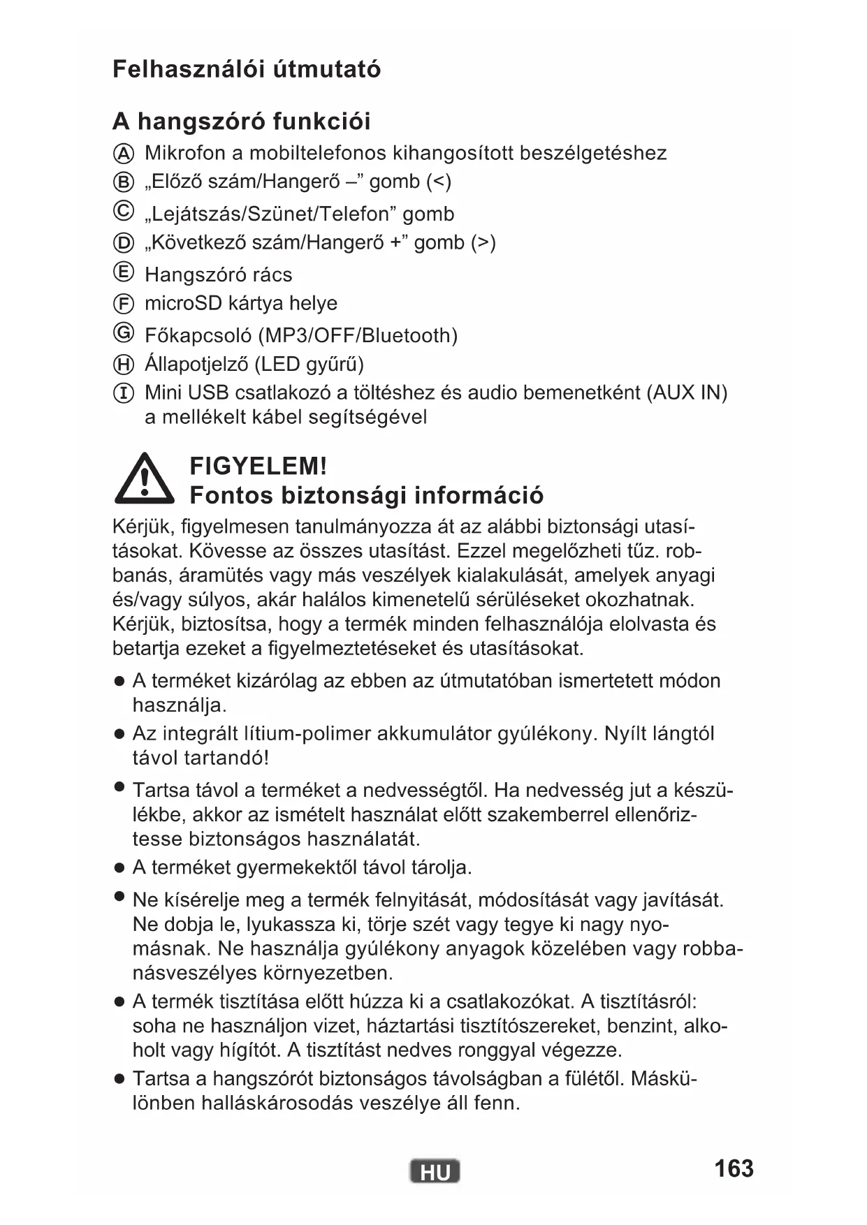 Mini USB csatlakozó a töltéshez és audio bemenetként (AUX IN) a mellékelt kábel segítségével FIGYELEM! Fontos biztonsági információ Kérjük, gyelmesen tanulmányozza át az alábbi biztonsági utasí- tásokat. Kövesse az összes utasítást. Ezzel megelőzheti tűz. rob- banás, áramütés vagy más veszélyek kialakulását, amelyek anyagi és/vagy súlyos, akár halálos kimenetelű sérüléseket okozhatnak. Kérjük, biztosítsa, hogy a termék minden felhasználója elolvasta és betartja ezeket a gyelmeztetéseket és utasításokat.