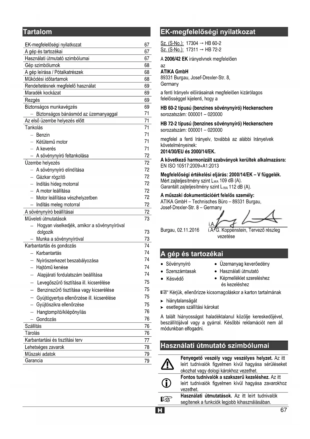 ATIKA GmbH 89331 Burgau, Josef-Drexler-Str. 8, Germany a fenti Irányelv előírásainak megfelelően kizárólagos felelősséggel kijelenti, hogy a HB 60-2 típusú (benzines sövénynyíró) Heckenschere sorozatszám: 000001 – 020000 HB 72-2 típusú (benzines sövénynyíró) Heckenschere sorozatszám: 000001 – 020000 megfelel a fenti Irányelv, továbbá az alábbi Irányelvek követelményeinek: 2014/30/EU és 2000/14/EK. A következő harmonizált szabványok kerültek alkalmazásra: