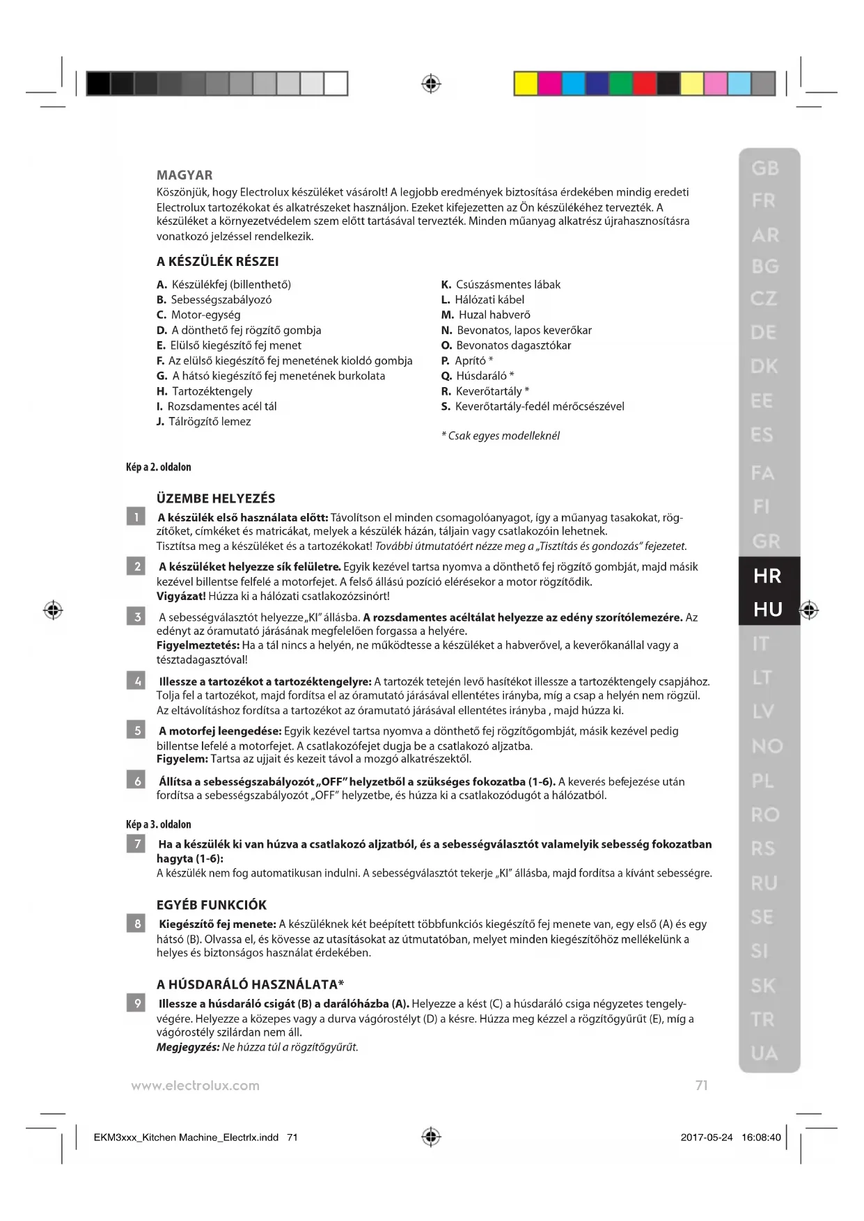 17 Húzza ki a készüléket a hálózatból. A drót habverő, a húsdaráló* és a szeletelő/reszelő* csak kézileg mosható meleg mosószeres vízzel. A tál, a lapos habverő és a dagasztóhorog mosogatógépben mosható. Az alkatrészeket mindig a felső rácsra helyezze, ha mosogatógépet használ. Vigyázat! A kések és a betétek nagyon élesek, sérülést okozhatnak. Figyelmeztetés! Sose merítse vízbe vagy más folyadékba a készülék testét, csatlakozóját és zsinórját. Használat előtt minden darabot hagyjon teljesen megszáradni. 18 A keverőtartály tisztítása*: Forgassa óramutató járásával ellentétes irányba a keverőtartályt, majd vegye le. Vegye le a fedelet. Öntse ki a ke- verőtartály tartalmát. Tegyen bele egy cseppnyi mosogatószert, és engedjen bele egy liter meleg vizet. Rögzítse a keverőtartályt a készülékhez. Járassa a készüléket a 6-os sebességen fél percig, majd öntse ki a vizet. Öblítse ki a keverőtartályt, és hagyja megszáradni. Vigyázat! A kések és a betétek nagyon élesek, sérülést okozhatnak.. 19 A készülék házát csak egy puha és nedves ronggyal tisztítsa le, majd törölje szárazra egy másikkal. Megjegyzés: A készülék külsejének tisztításához ne használjon súrolószert vagy dörzsszivacsot. Használja örömmel új Electrolux készülékét! EKM3xxx_Kitchen Machine_Electrlx.indd 72 2017-05-24 16:08:4073 www.electrolux.com