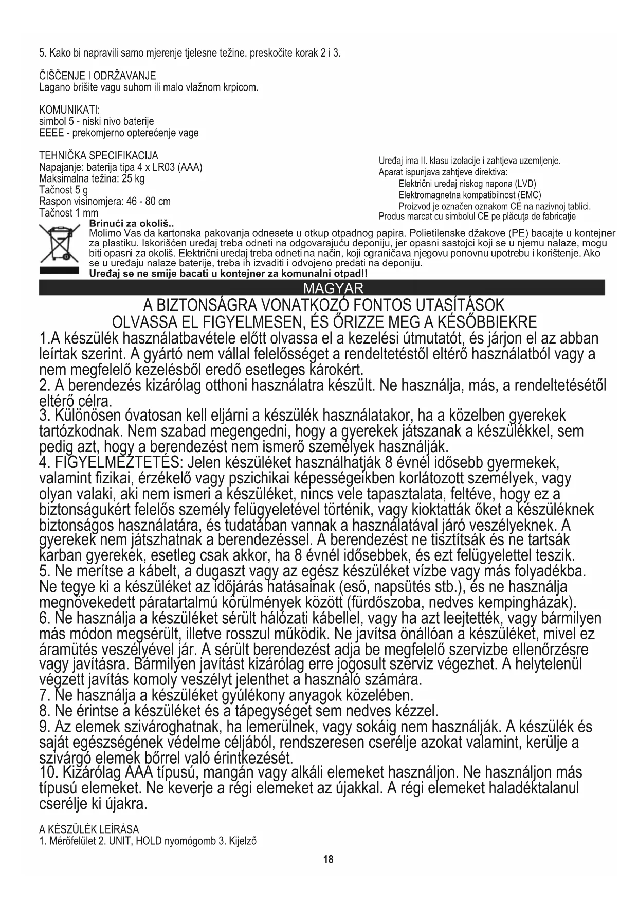 - Memorija vage: Memoriše maksimalno do 8 korisnika Do 15 rezultata mjerenja za svakog korisnika. Kad su već zapisani svih petnaest rezultata, najnoviji zapisat će se umjesto prvog. 17MAGYAR A BIZTONSÁGRA VONATKOZÓ FONTOS UTASÍTÁSOK OLVASSA EL FIGYELMESEN, ÉS ŐRIZZE MEG A KÉSŐBBIEKRE 1.A készülék használatbavétele előtt olvassa el a kezelési útmutatót, és járjon el az abban leírtak szerint. A gyártó nem vállal felelősséget a rendeltetéstől eltérő használatból vagy a nem megfelelő kezelésből eredő esetleges károkért.