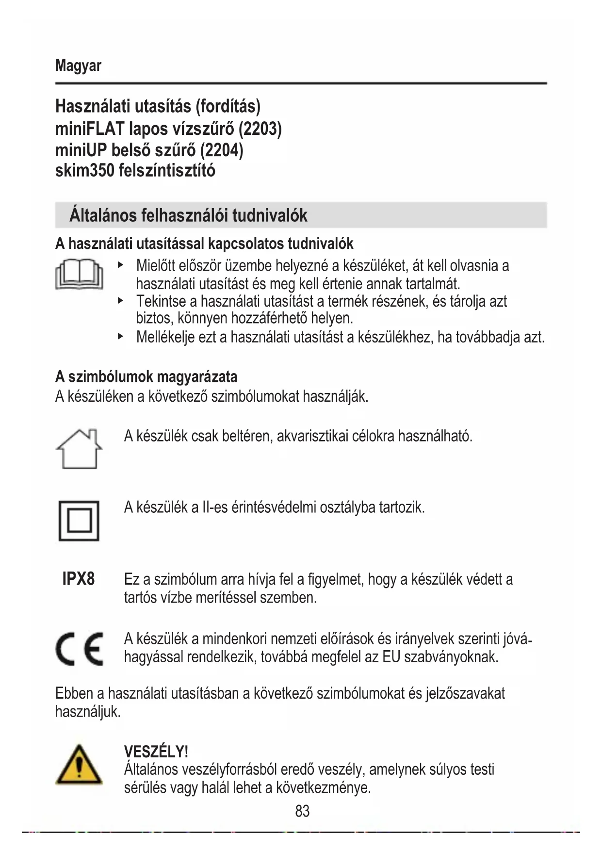 Használati utasítás (fordítás) miniFLAT lapos vízszűrő (2203) miniUP belső szűrő (2204) skim350 felszíntisztító Általános felhasználói tudnivalók A használati utasítással kapcsolatos tudnivalók ▶ Mielőtt először üzembe helyezné a készüléket, át kell olvasnia a használati utasítást és meg kell értenie annak tartalmát. ▶ Tekintse a használati utasítást a termék részének, és tárolja azt biztos, könnyen hozzáférhető helyen. ▶ Mellékelje ezt a használati utasítást a készülékhez, ha továbbadja azt. A szimbólumok magyarázata A készüléken a következő szimbólumokat használják. A készülék csak beltéren, akvarisztikai célokra használható. A készülék a II-es érintésvédelmi osztályba tartozik. Ez a szimbólum arra hívja fel a gyelmet, hogy a készülék védett a tartós vízbe merítéssel szemben. A készülék a mindenkori nemzeti előírások és irányelvek szerinti jóvá