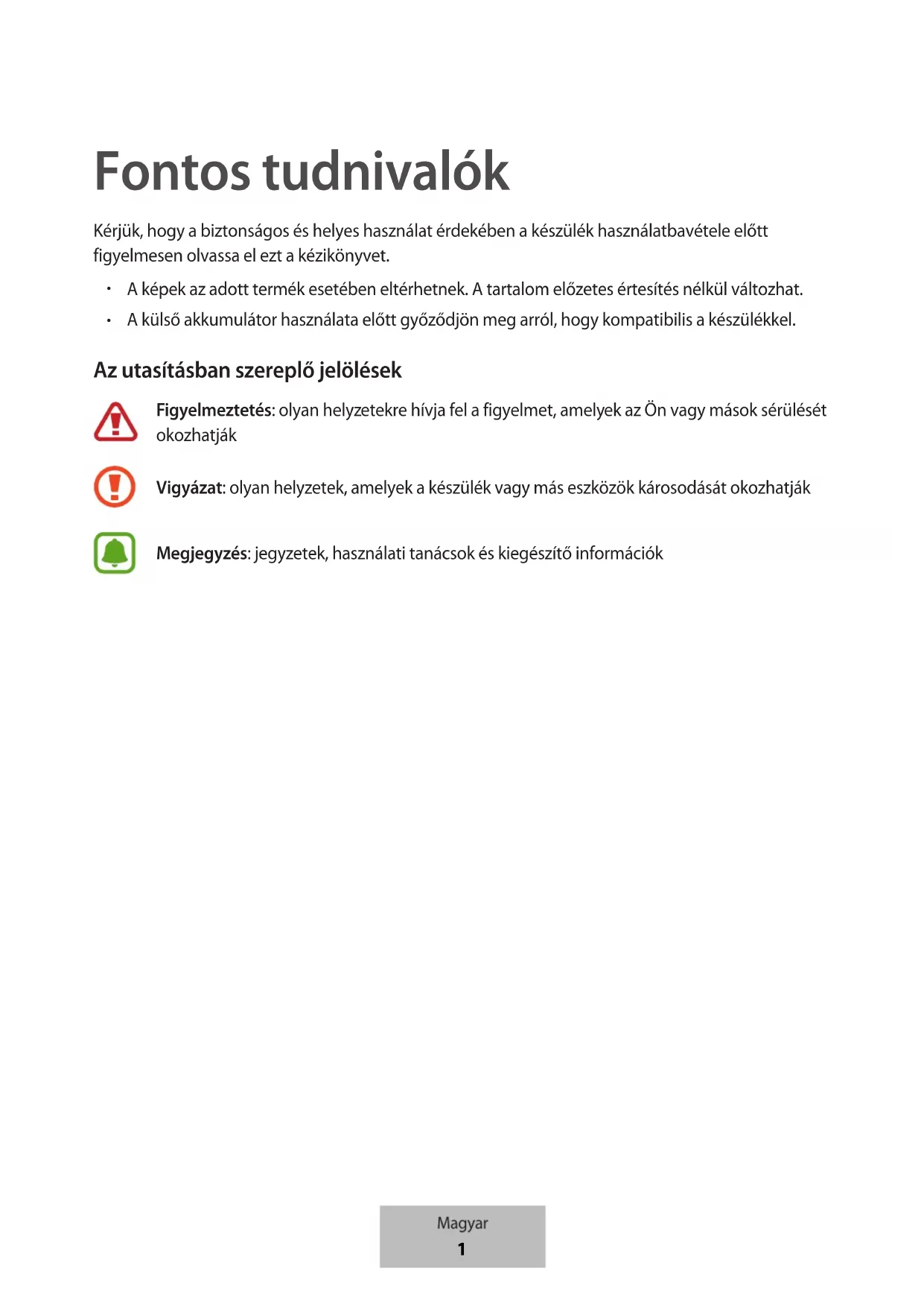 A külső akkumulátor használata előtt győződjön meg arról, hogy kompatibilis a készülékkel. Az utasításban szereplő jelölések Figyelmeztetés: olyan helyzetekre hívja fel a figyelmet, amelyek az Ön vagy mások sérülését okozhatják Vigyázat: olyan helyzetek, amelyek a készülék vagy más eszközök károsodását okozhatják Megjegyzés: jegyzetek, használati tanácsok és kiegészítő információk Magyar
