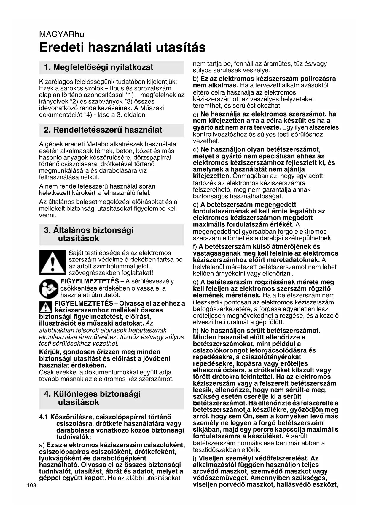 Eredeti használati utasítás Kizárólagos felelősségünk tudatában kijelentjük: Ezek a sarokcsiszolók – típus és sorozatszám alapján történő azonosítással *1) – megfelelnek az irányelvek *2) és szabványok *3) összes idevonatkozó rendelkezéseinek. A Műszaki dokumentációt *4) - lásd a 3. oldalon. A gépek eredeti Metabo alkatrészek használata esetén alkalmasak fémek, beton, kőzet és más hasonló anyagok köszörülésére, dörzspapírral történő csiszolására, drótkefével történő megmunkálására és darabolására víz felhasználása nélkül. A nem rendeltetésszerű használat során keletkezett károkért a felhasználó felel. Az általános balesetmegelőzési előírásokat és a mellékelt biztonsági utasításokat figyelembe kell venni. Saját testi épsége és az elektromos szerszám védelme érdekében tartsa be az adott szimbólummal jelölt szövegrészekben foglaltakat! FIGYELMEZTETÉS – A sérülésveszély csökkentése érdekében olvassa el a használati útmutatót. FIGYELMEZTETÉS – Olvassa el az ehhez a kéziszerszámhoz mellékelt összes biztonsági figyelmeztetést, előírást, illusztrációt és műszaki adatokat. Az alábbiakban felsorolt előírások betartásának elmulasztása áramütéshez, tűzhöz és/vagy súlyos testi sérülésekhez vezethet. Kérjük, gondosan őrizzen meg minden biztonsági utasítást és előírást a jövőbeni használat érdekében. Csak ezekkel a dokumentumokkal együtt adja tovább másnak az elektromos kéziszerszámot.