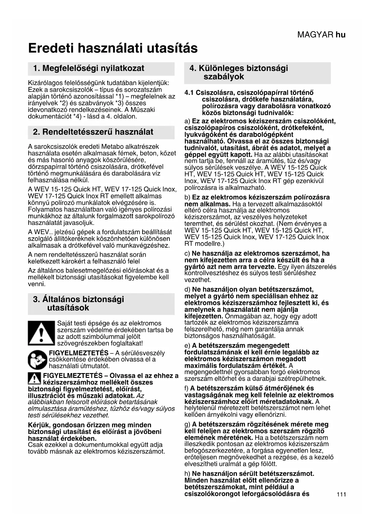 Eredeti használati utasítás Kizárólagos felelősségünk tudatában kijelentjük: Ezek a sarokcsiszolók – típus és sorozatszám alapján történő azonosítással *1) – megfelelnek az irányelvek *2) és szabványok *3) összes idevonatkozó rendelkezéseinek. A Műszaki dokumentációt *4) - lásd a 4. oldalon. A sarokcsiszolók eredeti Metabo alkatrészek használata esetén alkalmasak fémek, beton, kőzet és más hasonló anyagok köszörülésére, dörzspapírral történő csiszolására, drótkefével történő megmunkálására és darabolására víz felhasználása nélkül. A WEV 15-125 Quick HT, WEV 17-125 Quick Inox, WEV 17-125 Quick Inox RT emellett alkalmas könnyű polírozó munkálatok elvégzésére is. Folyamatos használatban való igényes polírozási munkákhoz az általunk forgalmazott sarokpolírozó használatát javasoljuk. A WEV.. jelzésű gépek a fordulatszám beállítását szolgáló állítókeréknek köszönhetően különösen alkalmasak a drótkefével való munkavégzéshez. A nem rendeltetésszerű használat során keletkezett károkért a felhasználó felel Az általános balesetmegelőzési előírásokat és a mellékelt biztonsági utasításokat figyelembe kell venni. Saját testi épsége és az elektromos szerszám védelme érdekében tartsa be az adott szimbólummal jelölt szövegrészekben foglaltakat! FIGYELMEZTETÉS – A sérülésveszély csökkentése érdekében olvassa el a használati útmutatót. FIGYELMEZTETÉS – Olvassa el az ehhez a kéziszerszámhoz mellékelt összes biztonsági figyelmeztetést, előírást, illusztrációt és műszaki adatokat. Az alábbiakban felsorolt előírások betartásának elmulasztása áramütéshez, tűzhöz és/vagy súlyos testi sérülésekhez vezethet. Kérjük, gondosan őrizzen meg minden biztonsági utasítást és előírást a jövőbeni használat érdekében. Csak ezekkel a dokumentumokkal együtt adja tovább másnak az elektromos kéziszerszámot.