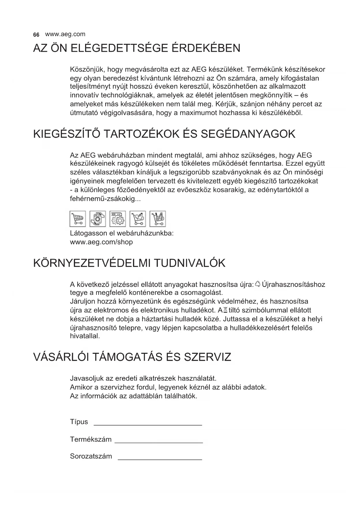 - Для заміни звертайтесь в технічну підтримку. («Для придбання звертайтесь в технічну під- тримку»).66 www.aeg.com AZ ÖN ELÉGEDETTSÉGE ÉRDEKÉBEN Köszönjük, hogy megvásárolta ezt az AEG készüléket. Termékünk készítésekor egy olyan beredezést kívántunk létrehozni az Ön számára, amely kifogástalan teljesítményt nyújt hosszú éveken keresztül, köszönhetően az alkalmazott innovatív technológiáknak, amelyek az életét jelentősen megkönnyítik – és amelyeket más készülékeken nem talál meg. Kérjük, szánjon néhány percet az útmutató végigolvasására, hogy a maximumot hozhassa ki készülékéből. KIEGÉSZÍTŐ TARTOZÉKOK ÉS SEGÉDANYAGOK Az AEG webáruházban mindent megtalál, ami ahhoz szükséges, hogy AEG készülékeinek ragyogó külsejét és tökéletes működését fenntartsa. Ezzel együtt széles választékban kínáljuk a legszigorúbb szabványoknak és az Ön minőségi igényeinek megfelelően tervezett és kivitelezett egyéb kiegészítő tartozékokat - a különleges főzőedényektől az evőeszköz kosarakig, az edénytartóktól a fehérnemű-zsákokig... Látogasson el webáruházunkba: www.aeg.com/shop