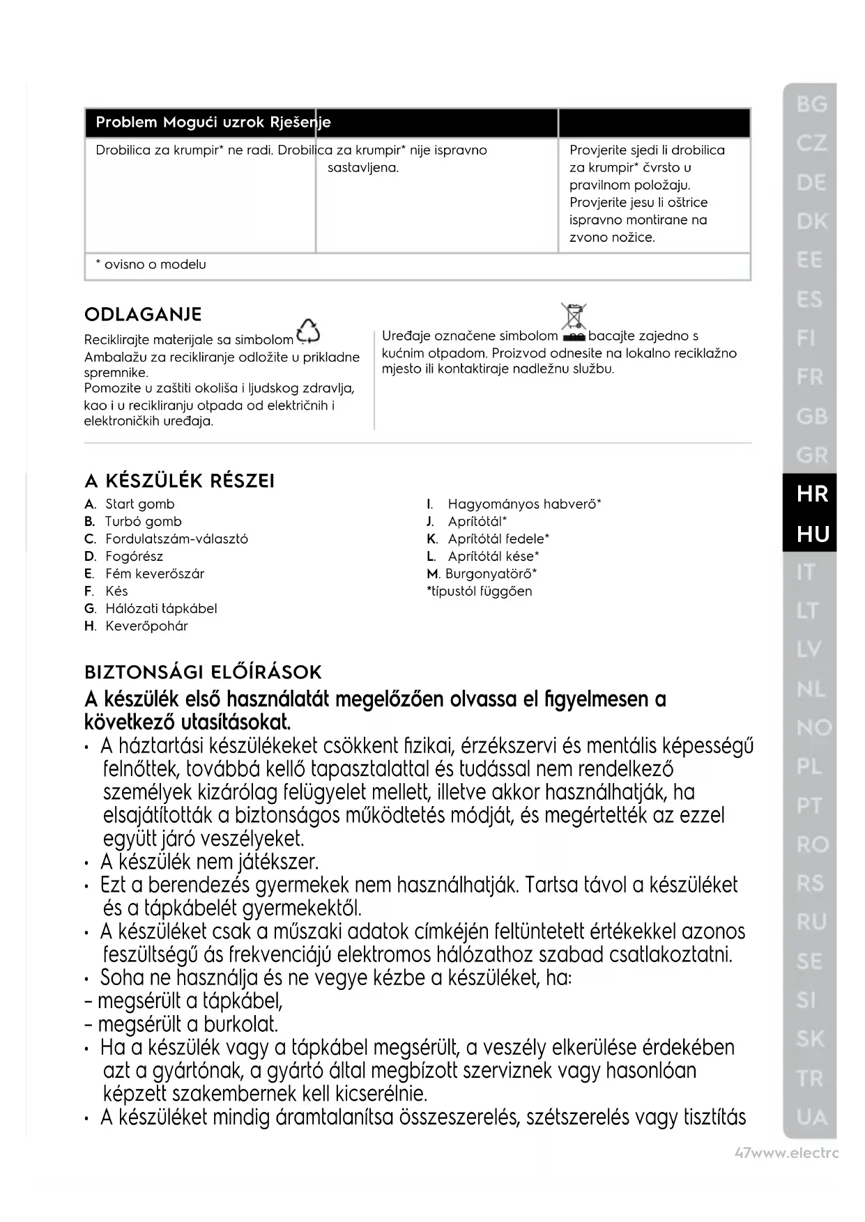 A következő jelzéssel ellátott anyagokat hasznosítsa újra: . Újrahasznosításhoz tegye a megfelelő konténerekbe a csomagolást. Járuljon hozzá környezetünk és egészségünk védelméhez, és hasznosítsa újra az elektromos és elektronikus hulladékot. A tiltó szimbólummal ellátott készüléket ne dobja a háztartási hulladék közé. Juttassa el a készüléket a helyi újrahasznosító telepre, vagy lépjen kapcsolatba a hulladékkezelésért felelős hivatallal. COMPONENTI A. Tasto Avvio B. Pulsante per alta velocità (Turbo) C. Selettore della velocità D. Impugnatura E. Albero di miscelazione di metallo F. Lama G. Cavo di alimentazione H. Bicchiere