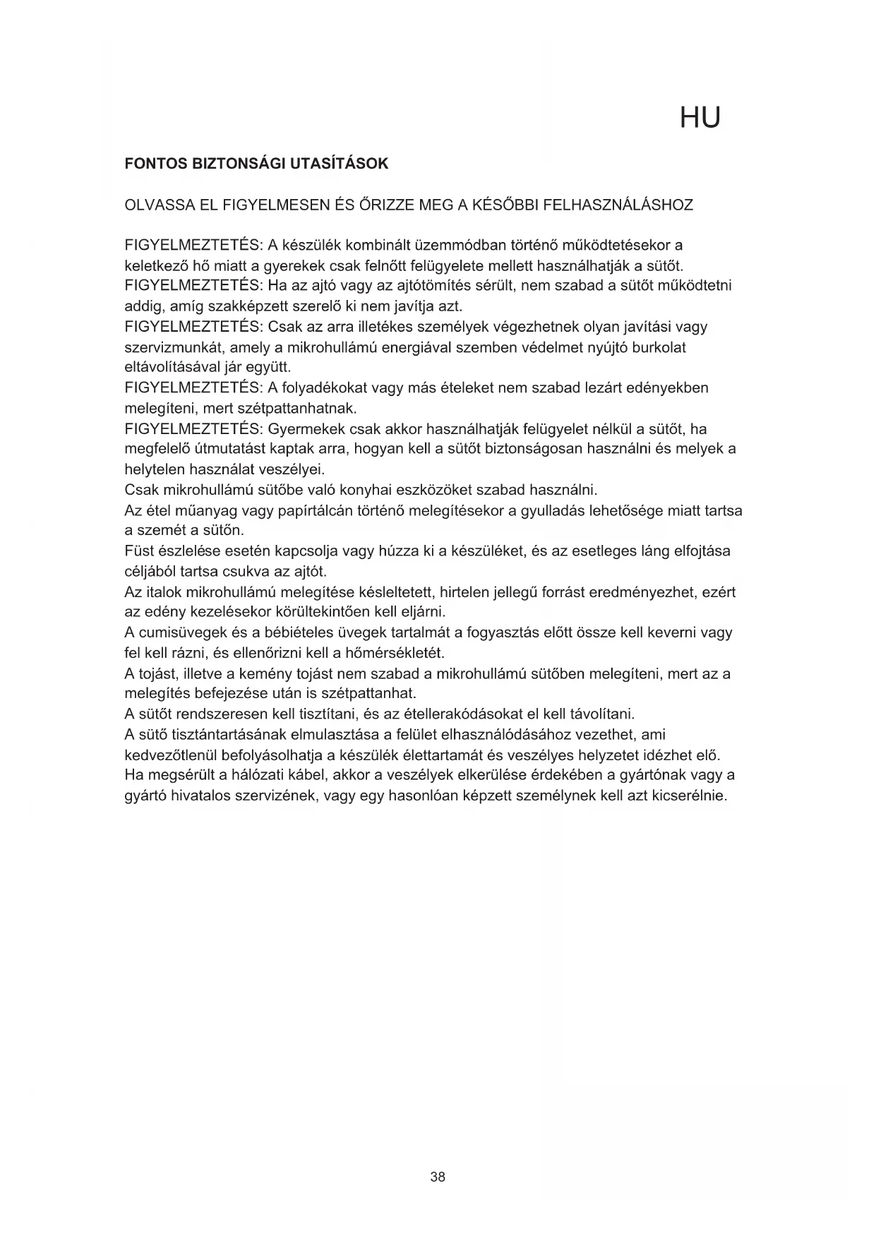 OLVASSA EL FIGYELMESEN ÉS ŐRIZZE MEG A KÉSŐBBI FELHASZNÁLÁSHOZ FIGYELMEZTETÉS: A készülék kombinált üzemmódban történő működtetésekor a keletkező hő miatt a gyerekek csak felnőtt felügyelete mellett használhatják a sütőt. FIGYELMEZTETÉS: Ha az ajtó vagy az ajtótömítés sérült, nem szabad a sütőt működtetni addig, amíg szakképzett szerelő ki nem javítja azt. FIGYELMEZTETÉS: Csak az arra illetékes személyek végezhetnek olyan javítási vagy szervizmunkát, amely a mikrohullámú energiával szemben védelmet nyújtó burkolat eltávolításával jár együtt. FIGYELMEZTETÉS: A folyadékokat vagy más ételeket nem szabad lezárt edényekben melegíteni, mert szétpattanhatnak. FIGYELMEZTETÉS: Gyermekek csak akkor használhatják felügyelet nélkül a sütőt, ha megfelelő útmutatást kaptak arra, hogyan kell a sütőt biztonságosan használni és melyek a helytelen használat veszélyei. Csak mikrohullámú sütőbe való konyhai eszközöket szabad használni. Az étel műanyag vagy papírtálcán történő melegítésekor a gyulladás lehetősége miatt tartsa a szemét a sütőn. Füst észlelé se esetén kapcsolja vagy húzza ki a készüléket, és az esetleges láng elfojtása céljából tartsa csukva az ajtót. Az italok mikrohullámú melegítése késleltetett, hirtelen jellegű forrást eredményezhet, ezért az edény kezelésekor körültekintően kell eljárni. A cumisüvegek és a bébiételes üvegek tartalmát a fogyasztás előtt össze kell keverni vagy fel kell rázni, és ellenőrizni kell a hőmérsékletét. A tojást, illetve a kemény tojást nem szabad a mikrohullámú sütőben melegíteni, mert az a melegítés befejezése után is szétpattanhat. A sütőt rendszeresen kell tisztítani, és az étellerakódásokat el kell távolítani. A sütő tisztántartásának elmulasztása a felület elhasználódásához vezethet, ami kedvezőtlenül befolyásolhatja a készülék élettartamát és veszélyes helyzetet idézhet elő. Ha megsérült a hálózati kábel, akkor a veszélyek elkerülése érdekében a gyártónak vagy a gyártó hivatalos szervizének, vagy egy hasonlóan képzett személynek kell azt kicserélnie.