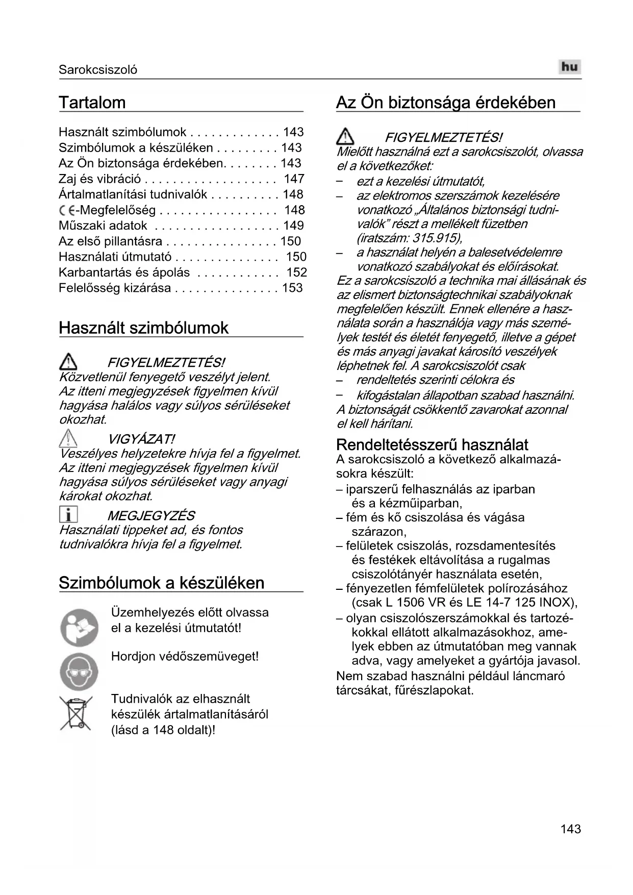 kifogástalan állapotban szabad használni. A biztonságát csökkentő zavarokat azonnal el kell hárítani. Rendeltetésszerű használat A sarokcsiszoló a következő alkalmazá- sokra készült: – iparszerű felhasználás az iparban és a kézműiparban, – fém és kő csiszolása és vágása szárazon, – felületek csiszolás, rozsdamentesítés és festékek eltávolítása a rugalmas csiszolótányér használata esetén, – fényezetlen fémfelületek polírozásához (csak L 1506 VR és LE 14-7 125 INOX), – olyan csiszolószerszámokkal és tartozé- kokkal ellátott alkalmazásokhoz, ame- lyek ebben az útmutatóban meg vannak adva, vagy amelyeket a gyártója javasol. Nem szabad használni például láncmaró tárcsákat, fűrészlapokat.Sarokcsiszoló