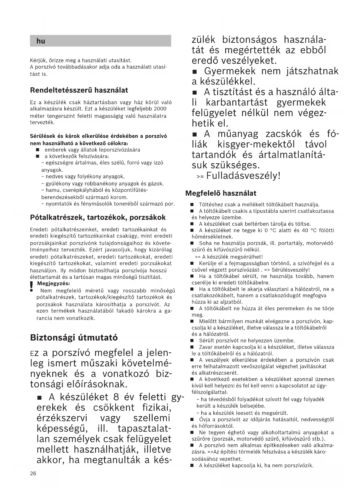 Kérjük, őrizze meg a használati utasítást.A porszívó továbbadásakor adja oda a használati utasí-tást is. Rendeltetésszerű használat Ez a készülék csak háztartásban vagy ház körül való alkalmazásra készült. Ezt a készüléket legfeljebb 2000 méter tengerszint feletti magasságig való használatra tervezték.Sérülések és károk elkerülése érdekében a porszívó nem használható a következő célokra: emberek vagy állatok leporszívózására a következők felszívására: − egészségre ártalmas, éles szélű, forró vagy izzó anyagok. − nedves vagy folyékony anyagok. − gyúlékony vagy robbanékony anyagok és gázok. − hamu, cserépkályhából és központifűtés-berendezésekből származó korom. − nyomtatók és fénymásolók toneréből származó por. Pótalkatrészek, tartozékok, porzsákok Eredeti pótalkatrészeinket, eredeti tartozékainkat és eredeti kiegészítő tartozékainkat csakúgy, mint eredeti porzsákjainkat porszívónk tulajdonságaihoz és követe-lményeihez tervezték. Ezért javasoljuk, hogy kizárólag eredeti pótalkatrészeket, eredeti tartozékokat, eredeti kiegészítő tartozékokat, valamint eredeti porzsákokat használjon. Ily módon biztosíthatja porszívója hosszú élettartamát és a tartósan magas minőségű tisztítást. Megjegyzés: Nem megfelelő méretű vagy rosszabb minőségű pótalkatrészek, tartozékok/kiegészítő tartozékok és porzsákok használata károsíthatja a porszívót. Az ezen termékek használatából fakadó károkra a ga-rancia nem vonatkozik. Biztonsági útmutató Ez a porszívó megfelel a jelen- leg ismert műszaki követelmé- nyeknek és a vonatkozó biz- tonsági előírásoknak. A készüléket 8 év feletti gy- erekek és csökkent fizikai, érzékszervi vagy szellemi képességű, ill. tapasztalat- lan személyek csak felügyelet mellett használhatják, illetve akkor, ha megtanulták a kés- zülék biztonságos használa- tát és megértették az ebből eredő veszélyeket. Gyermekek nem játszhatnak a készülékkel. A tisztítást és a használó álta- li karbantartást gyermekek felügyelet nélkül nem végez- hetik el. A műanyag zacskók és fó- liák kisgyer-mekektől távol tartandók és ártalmatlanítá- suk szükséges. >= Fulladásveszély! Megfelelő használat Töltéshez csak a mellékelt töltőkábelt használja. A töltőkábelt csakis a típustábla szerint csatlakoztassa és helyezze üzembe. A készüléket csak beltérben tárolja és töltse. A készüléket ne tegye ki 0 °C alatti és 40 °C fölötti hőmérsékletnek. Soha ne használja porzsák, ill. portartály, motorvédő szűrő és kifúvószűrő nélkül.>= A készülék megsérülhet! Kerülje el a fejmagasságban történő, a szívófejjel és a csővel végzett porszívózást . => Sérülésveszély! Ha a töltőkábel sérült, ne használja tovább, hanem cserélje ki eredeti töltőkábelre. Ha a töltőkábelt le akarja választani a hálózatról, ne a csatlakozókábelt, hanem a csatlakozódugót megfogva húzza ki az aljzatból. A töltőkábelt ne húzza át éles peremeken és ne törje meg. Mielőtt bármilyen munkát elvégezne a porszívón, kap-csolja ki a készüléket, illetve válassza le a töltőkábelről és a hálózatról. Sérült porszívót ne helyezzen üzembe. Zavar esetén kapcsolja ki a készüléket, illetve válassza le a töltőkábelről és a hálózatról. A veszélyek elkerülése érdekében a porszívón csak erre felhatalmazott vevőszolgálat végezhet javításokat és alkatrészcserét. A következő esetekben a készüléket azonnal üzemen kívül kell helyezni és fel kell venni a kapcsolatot az ügy-félszolgálattal: − ha tévedésből folyadékot szívott fel vagy folyadék került a készülék belsejébe. − ha a készülék leesett és megsérült. Óvja a porszívót az időjárás hatásaitól, nedvességtől és hőforrásoktól. Ne tegyen éghető vagy alkoholtartalmú anyagokat a szűrőre (porzsák, motorvédő szűrő, kifúvószűrő stb.). A porszívó nem alkalmas építkezéseken való alkalma-zásra. =>Az építési törmelék felszívása a készülék káro-sodásához vezethet. A készüléket kapcsolja ki, ha nem porszívózik.27 A csomagolás védi a porszívót a szállítás során keletkező sérülésektől. Ezért azt tanácsoljuk, hogy szállítás céljára őrizze meg a csomagolást. Akkumulátorok Készüléke lítiumion-akkumulátorokkal rendelkezik, melyek biztonsági okokból csak szakemberek számára hozzáférhetők. Az akkumulátorok cseréjéhez forduljon az Önhöz legközelebbi vevőszolgálathoz vagy felhatalmazott szakkereskedőhöz. Szállítási tudnivalók A készülékben található Li-ion-akkukra a veszélyes anya- gokra vonatkozó rendelkezések követelményei vonat- koznak. Az akkukat a felhasználó további követelmények teljesítése nélkül szállíthatja az utcán. Harmadik fél általi szállítás (pl. légi szállítás vagy szállítmányozás) esetén figyelembe kell venni a csomagolásra és címkézésre vonatkozó különleges előírásokat. Ebben az esetben a csomag előkészítésénél be kell vonni egy veszélyesáru- szakértőt. Ártalmatlanítási tudnivalók Lehetővé kell tenni a porszívó, az akkumulátorok, a tartozékok és a csomagolás környezetbarát újrahasz- nosítását. Ne dobja a porszívót és az akkukat/elemeket a háztartá- si szemétbe! Csomagolás A csomagolás védi a porszívót a szállítás során keletkező sérülésektől. A csomagolás környezet- barát anyagokból készült, és ezért újrafeldolgozásra alkalmas. A továbbiakban már nem szükséges cso- magolóanyagot helyezze el a szelektív gyűjtőhelyek megfelelő tárolóiban. Régi készülék A készülék újratölthető lítiumion-akkumulátorokat tartalmaz. Ezért a készüléket csak erre felhatalma- zott vevőszolgálaton vagy