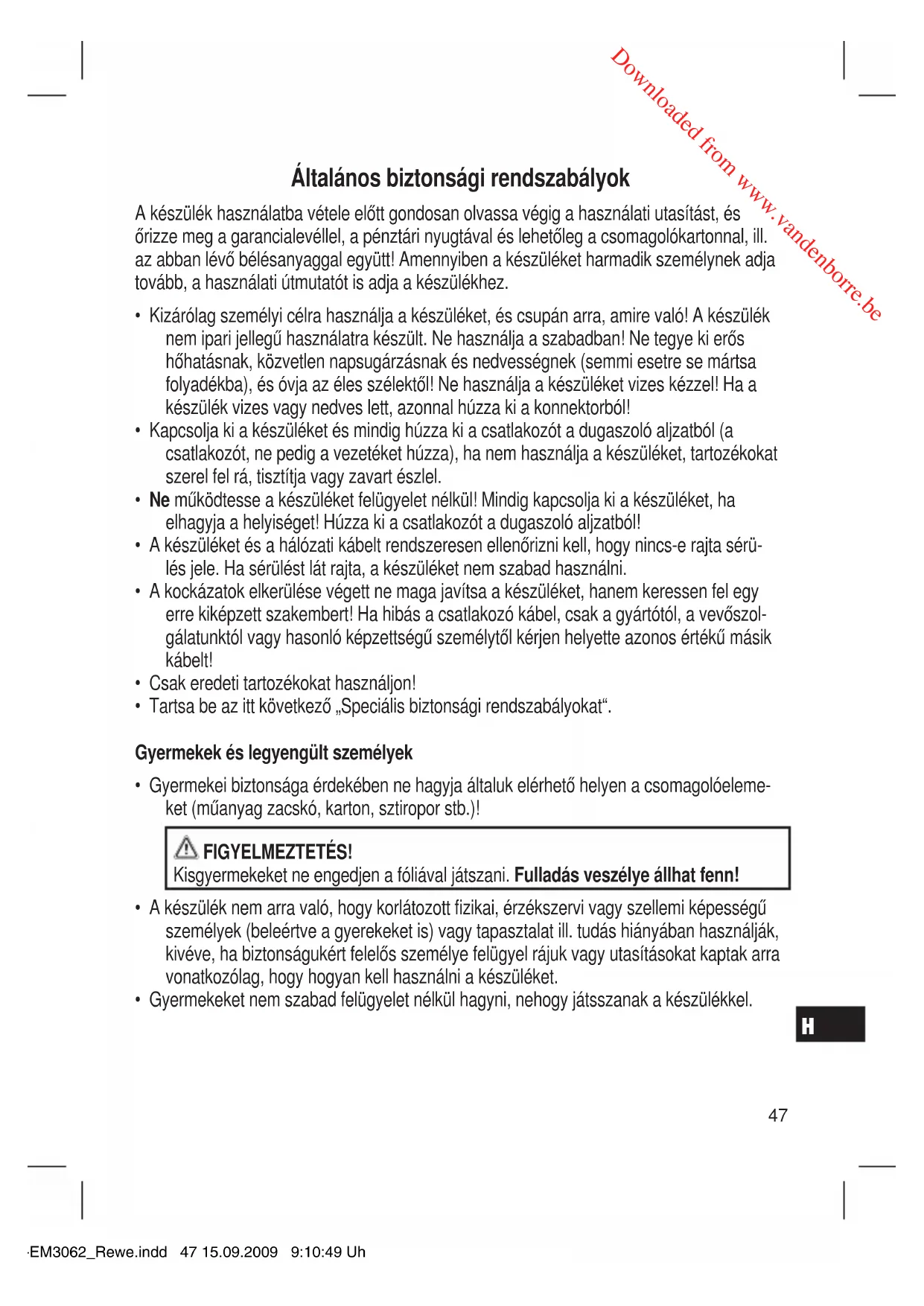 - Gyermekeket nem szabad felügyelet nélkül hagyni, nehogy játsszanak a készülékkel. 05-EM3062_Rewe.indd 47 15.09.2009 9:10:49 Uhr Downloaded from www.vandenborre.beH