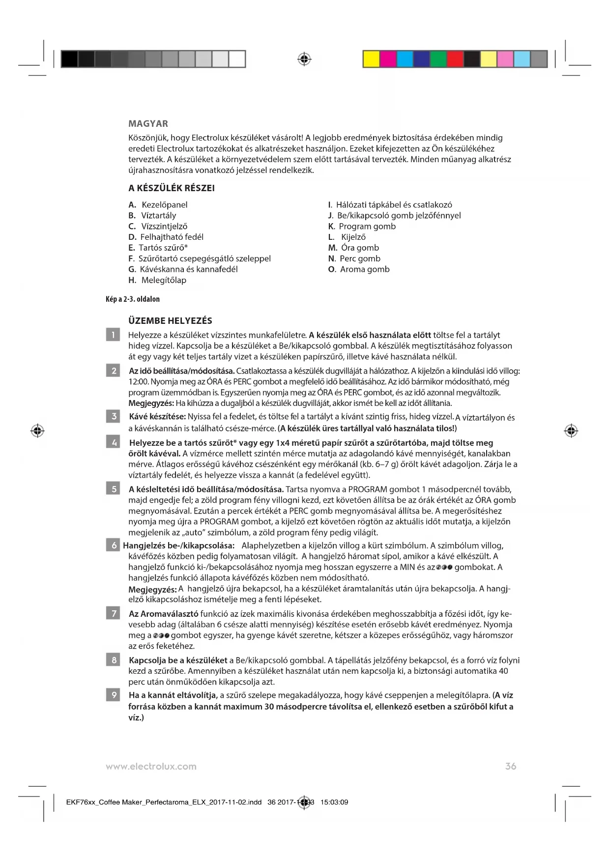- Tisztítás vagy karbantartás előtt, illetve használat után mindig kapcsolja ki a készüléket és húzza ki a tápkábelt a hálózati aljzatból. EKF76xx_Coffee Maker_Perfectaroma_ELX_2017-11-02.indd 37 2017-11-03 15:03:0938 www.electrolux.com