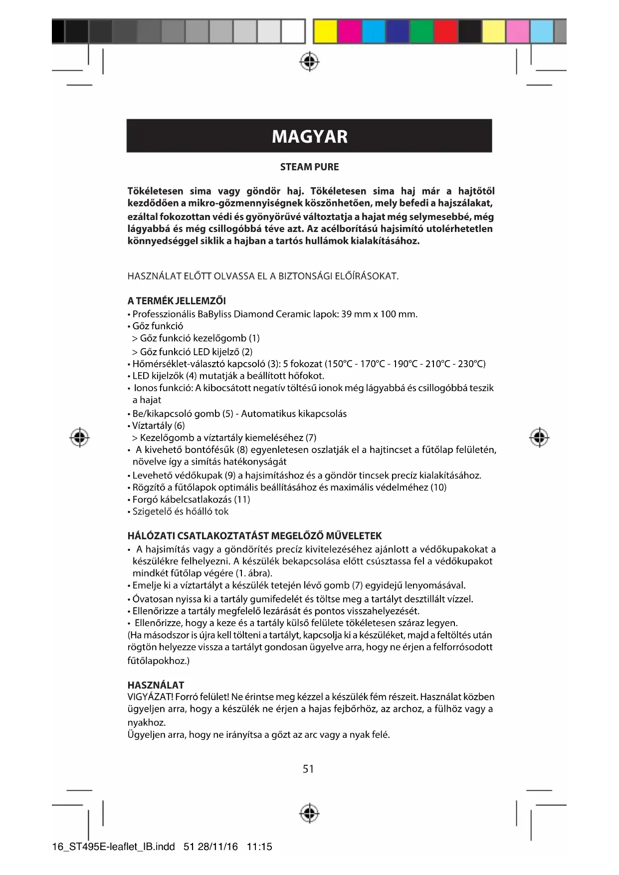 - Αποθηκεύετε τη συσκευή ισιώματος με τις πλάκες κλειστές, για να τις προστατέψετε αποτελεσματικά με το σύστημα κλειδώματος των πλακών (10). 16_ST495E-leaflet_IB.indd 50 28/11/16 11:1551 MAGYAR STEAM PURE Tökéletesen sima vagy göndör haj. Tökéletesen sima haj már a hajtőtől kezdődően a mikro-gőzmennyiségnek köszönhetően, mely befedi a hajszálakat, ezáltal fokozottan védi és gyönyörűvé változtatja a hajat még selymesebbé, még lágyabbá és még csillogóbbá téve azt. Az acélborítású hajsimító utolérhetetlen könnyedséggel siklik a hajban a tartós hullámok kialakításához. HASZNÁLAT ELŐTT OLVASSA EL A BIZTONSÁGI ELŐÍRÁSOKAT.