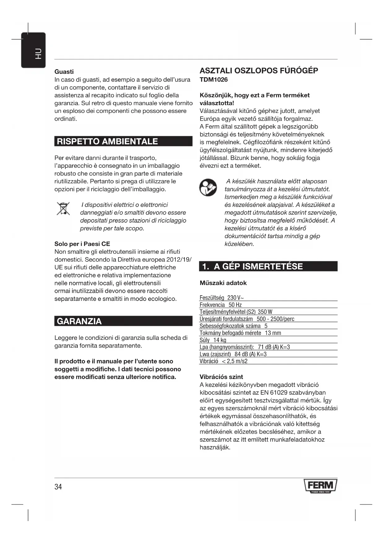 TDM1026 Köszönjük, hogy ezt a Ferm terméket választotta! Választásával kitűnő géphez jutott, amelyet Európa egyik vezető szállítója forgalmaz. A Ferm által szállított gépek a legszigorúbb biztonsági és teljesítmény követelményeknek is megfelelnek. Cégfilozófiánk részeként kitűnő ügyfélszolgáltatást nyújtunk, mindenre kiterjedő jótállással. Bízunk benne, hogy sokáig fogja élvezni ezt a terméket. Akészülékhasználataelőttalaposan tanulmányozza át a kezelési útmutatót. Ismerkedjen meg a készülék funkcióival és kezelésének alapjaival. A készüléket a megadott útmutatások szerint szervizelje, hogybiztosítsamegfelelőműködését.A kezelésiútmutatótésakísérő dokumentációt tartsa mindig a gép közelében.